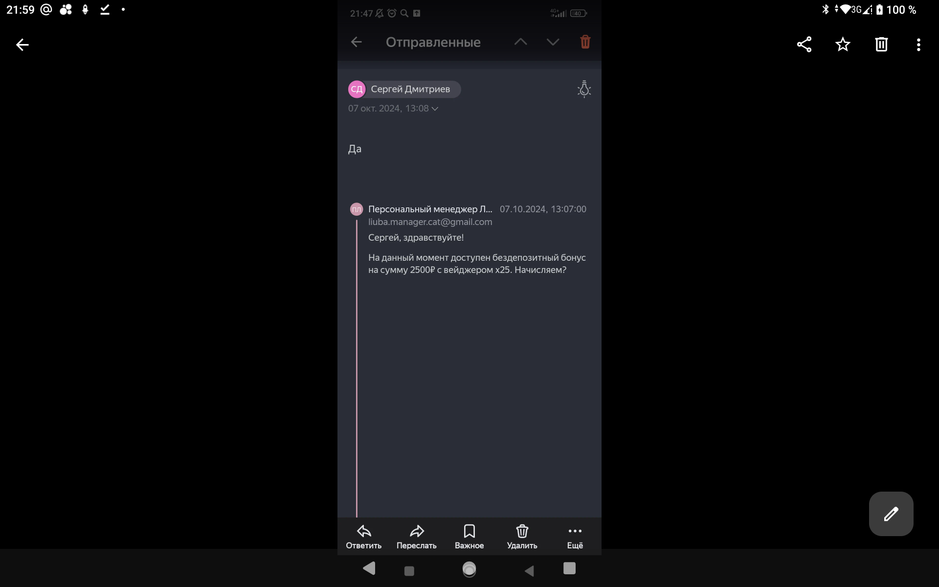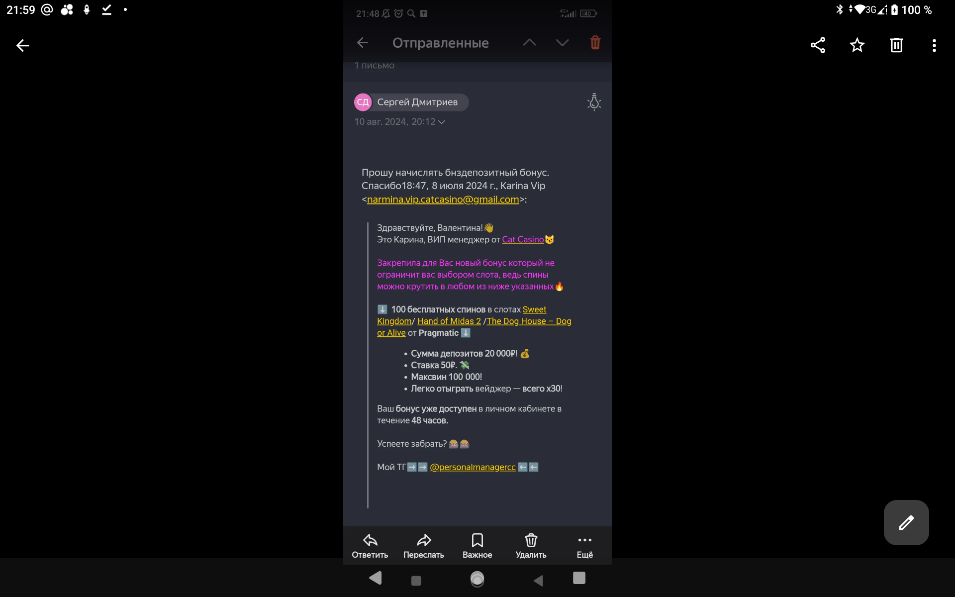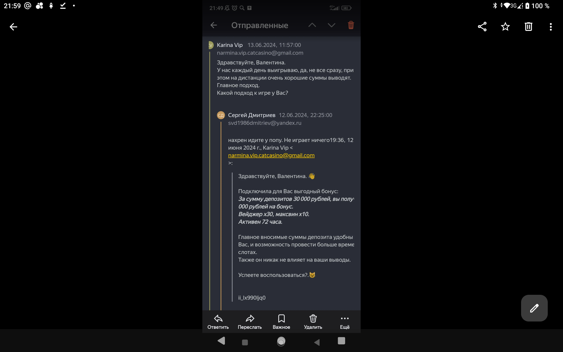 2) не было никакого звонка от сына в казино с целью дать бездеп, было письмо на почте. На скринах это просматривается, как и на самих ответах, не понятно, кто отвечал и т.д, опять догадки от котов.Пусть казино предоставить доказательства этого звонка если он есть у них в записи ,а не сочиняет!!Но у них нет этой записи в принципе ,иначе бы предоставили 💯.