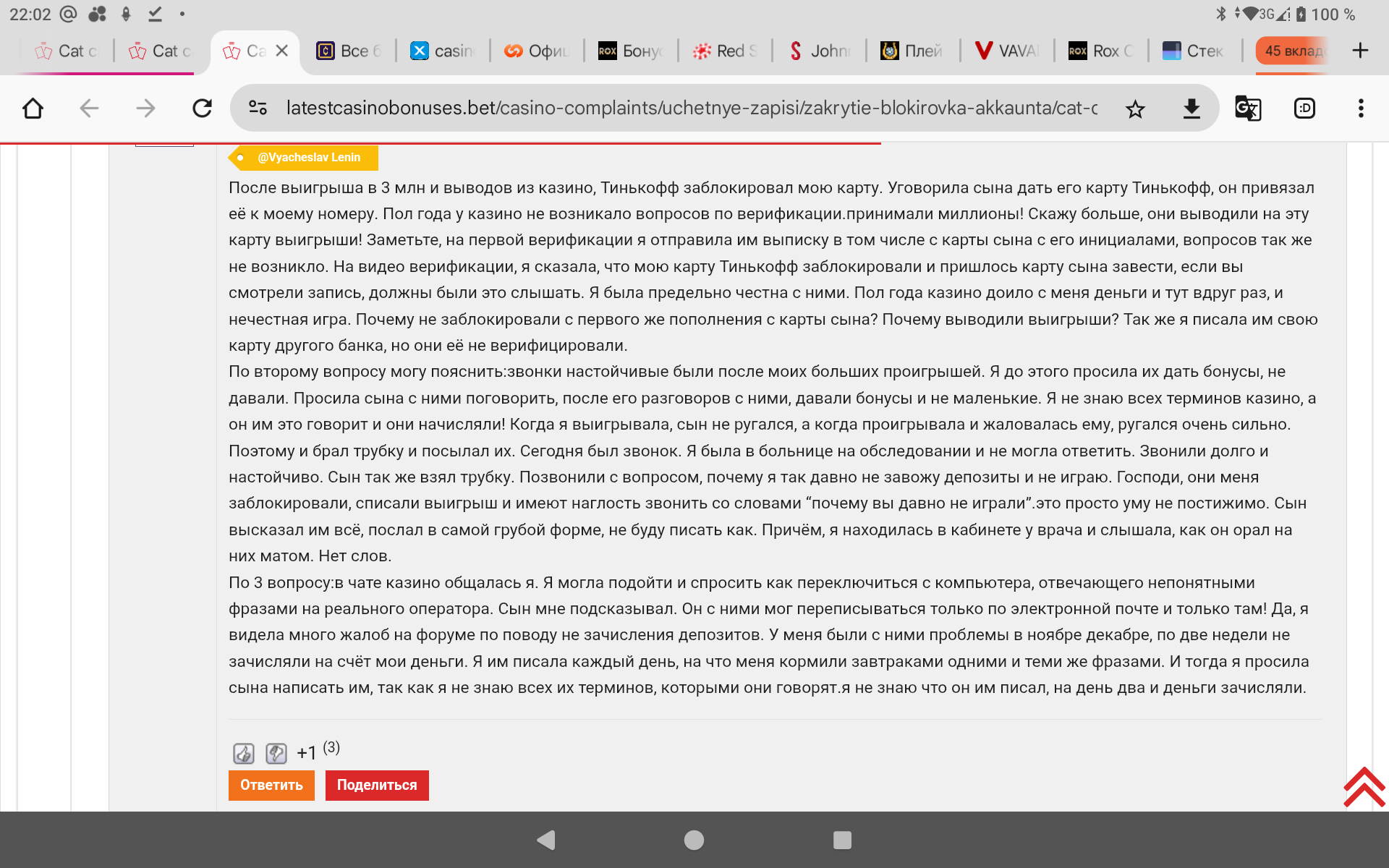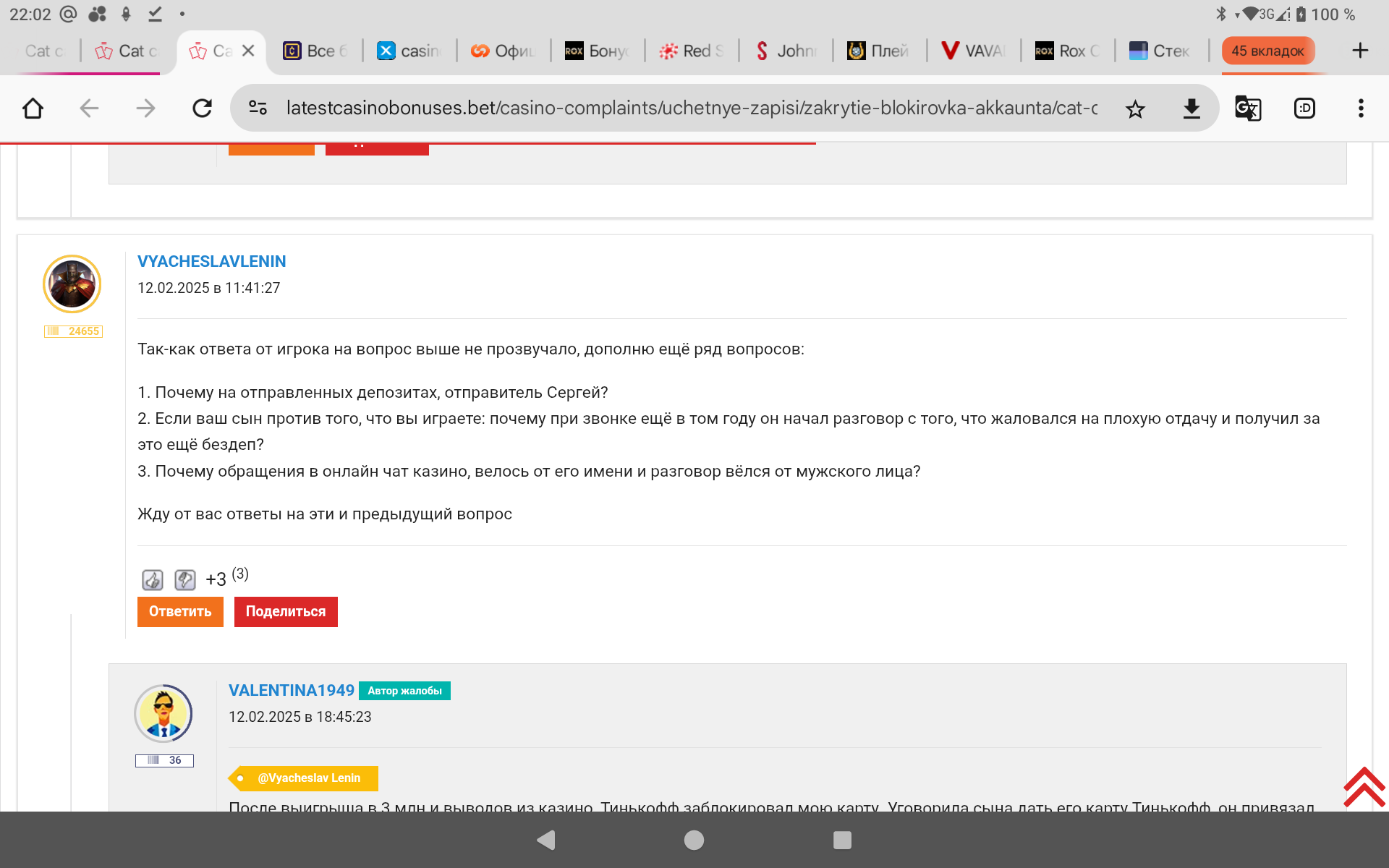 Мы выяснили в процессе разбора жалобы,что когда Игроку заблокировали ее карту Тинькофф за большой оборот и принятие ,заметьте!!!очередной выплаты на себя ,30.50.240.300 тысяч и выводы были с котов, То игрок Валентина честно спросила у администрации Кэт,может ли она продолжать вносить депозиты с карты ее сына,также через сбп,которую она привязала к своему номеру телефона и ей разрешили это делать!!!!!!!!!! Соответственно они принимали депозиты в количестве 76!!!!!!!с карты ее сына через сбп от Валентины Федоровны,ведь вносила то депозиты она своими деньгами!!!!!!!Ну а почему Тинькофф,думаю все понимают,потому что т-банк до последнего не блочит при игре и депах и он оптимален для серьезных сумм!!!!Это Факт!!!!!Тем более,что верифицировать другие карты,после блокировки т банком основной карты Валентины и принятии депозитов с карты ее сына, коты почему то отказались ей для депов!!!Не кажется ли это странным?!?)))