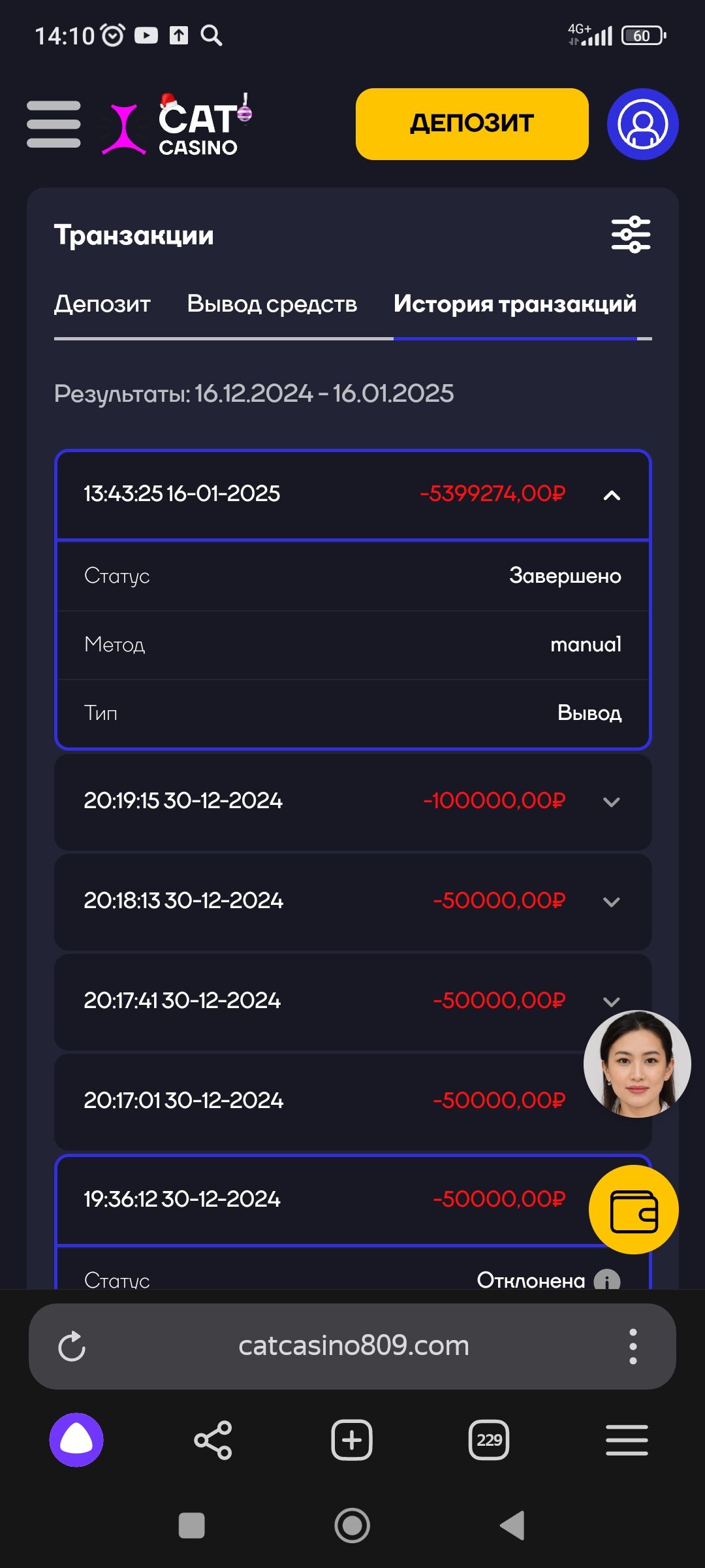 Депозиты были с её платежек — выводы были на её платежки, откуда собственно деньги тоже обьяснила (к слову не обязана была этого делать и никто не вправе этого вопроса был ей задавать,но все же она исчерпывающе все обьяснила и не верующим во все и самим от Cat casino сотрудникам.