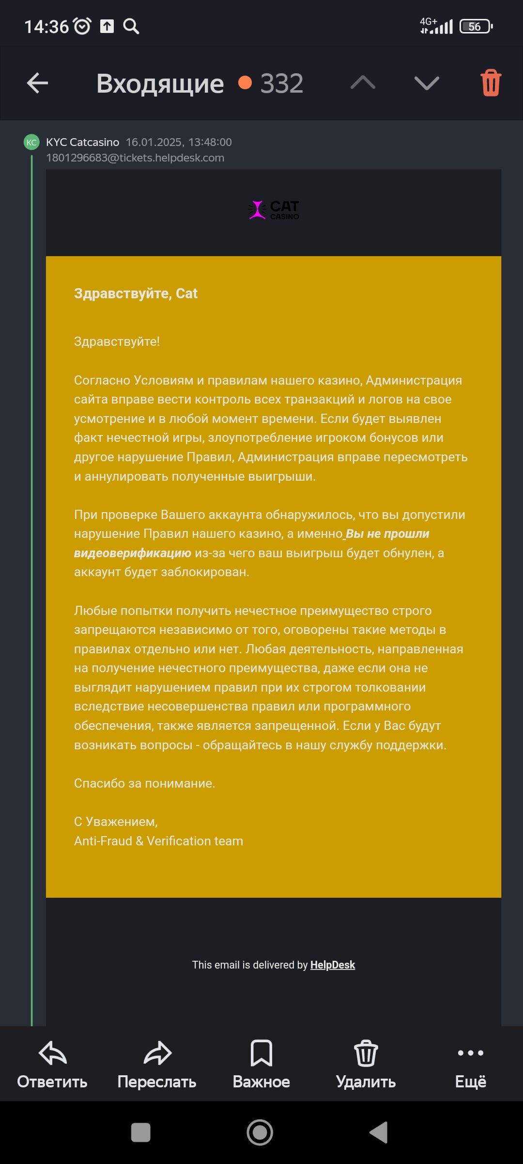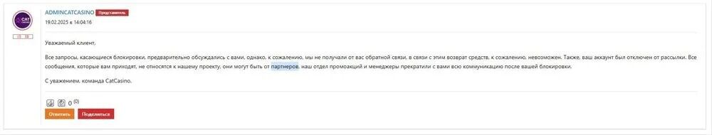 Также игровые люди участник нашего форума и гости форума!!!Недавно мы выяснили новую информацию по Кэт казино и их сетке!!Оказывается ,они целенаправленно используют все личные ,персональные и конфиденциальные данные всех!!!своих игроков в личных целях для приобретения выгоды,то есть элементарно передают,продают и прочее их третьим лицам и другим проектам и т.д , доказательства на скрине ниже!!!!!Это прямой ответ представителя Catcasino в жалобе одного из игроков ,которому они заблокировали аккаунт,перед этим вытянув с игрока по максимуму денежных средств.Он прямо об этом заявляет!!!!!!!