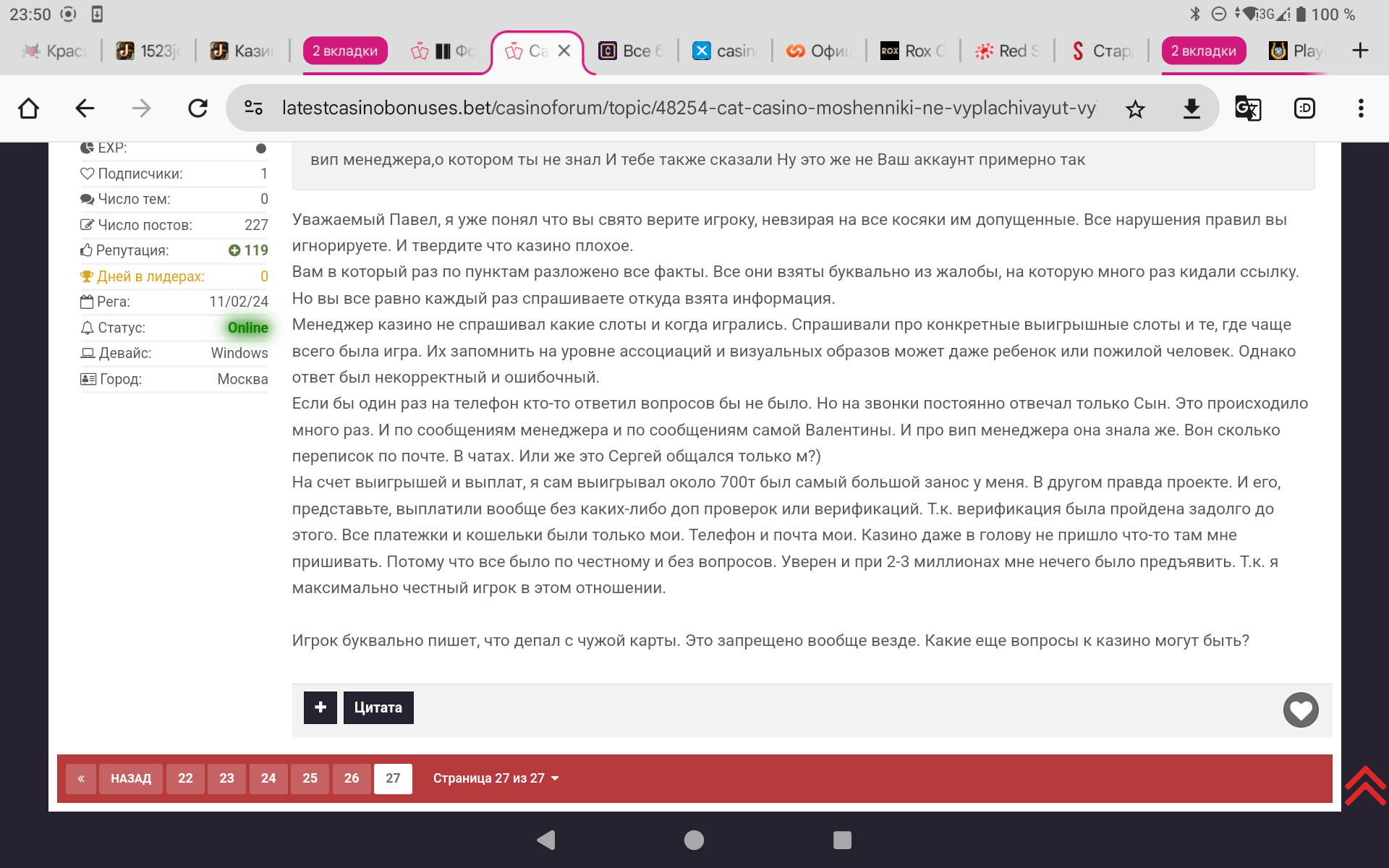 Так что мы имеем на сегодня на 21 февраля 2025 года,(16.01.2025 г.жалоба была инициирована и в работе у нашего Арбитра Вячеслава Ленина)в результате продолжающегося разбора жалобы нашего игрока из Поволжья Валентины Федоровны,которой посчастливилось выиграть в так называемом Catcasino Целых!!!!! 5.400.000 рублей!!!!!,давайте ещё раз подведем небольшой итог и статистику !