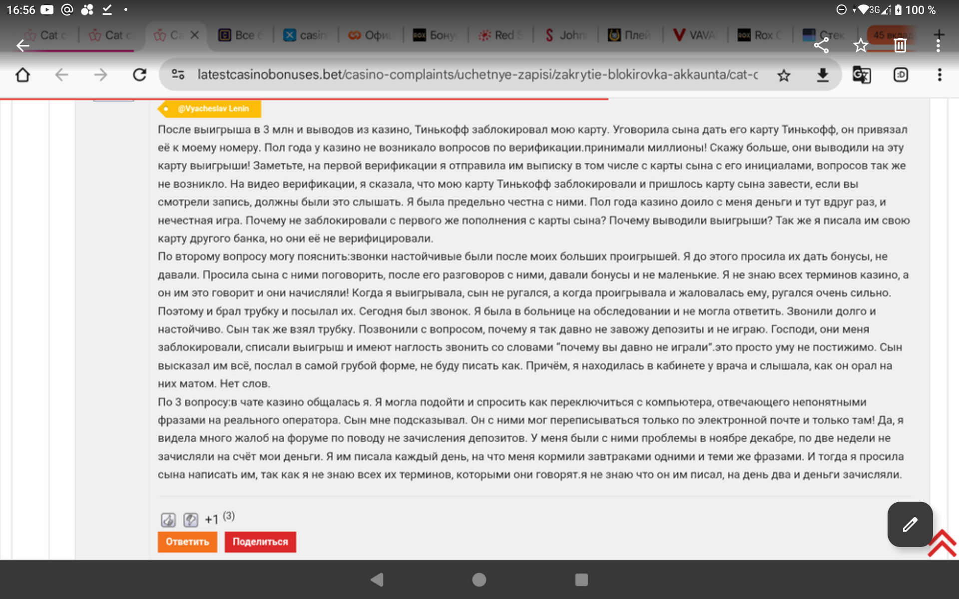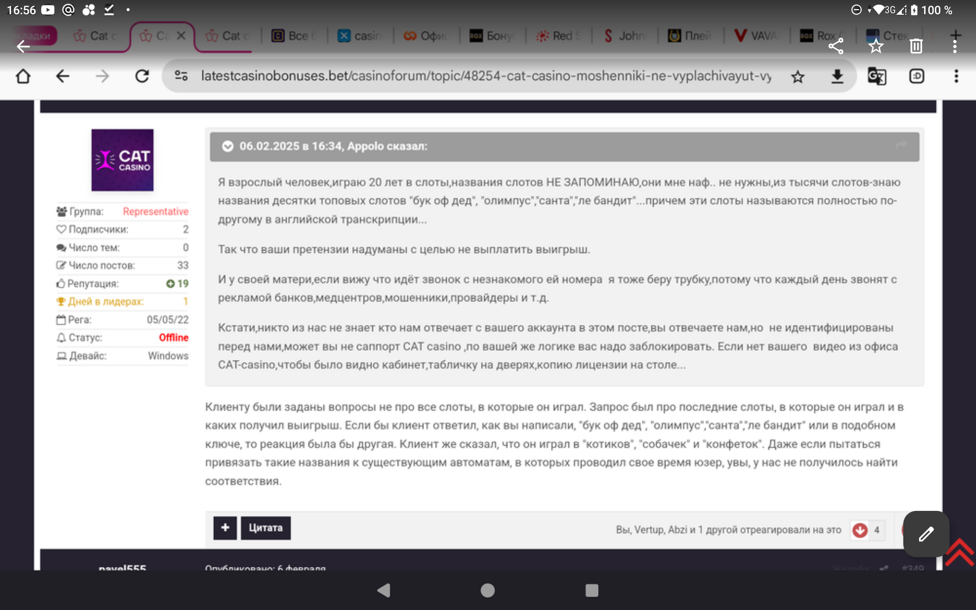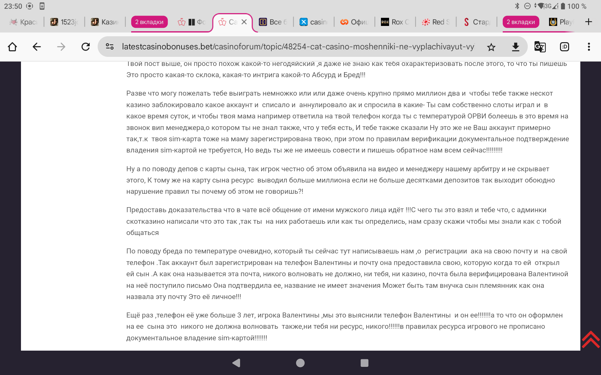 К слову,Валентине Федоровне опять звонили на телефон и предлагали продолжить игру в этом 🤣🤣🤣 так называемом Кэт!!!!!!Вы только вдумайтесь,Игроки!!!!Они кинули ее на 5,4 миллиона рублей ,отказав по надуманным причинам и без оснований в выводе честного выигрыша,только потому что она не знала названия слотов в которых выиграла и на ее телефон ответил мужским голосом ее сын,когда она не слышала звонок и это стало аргументом,что аккаунт не ее вначале и теперь ещё и звонят и предлагают снова сыграть!!!Цинизм зашкаливает!!!!!!!!