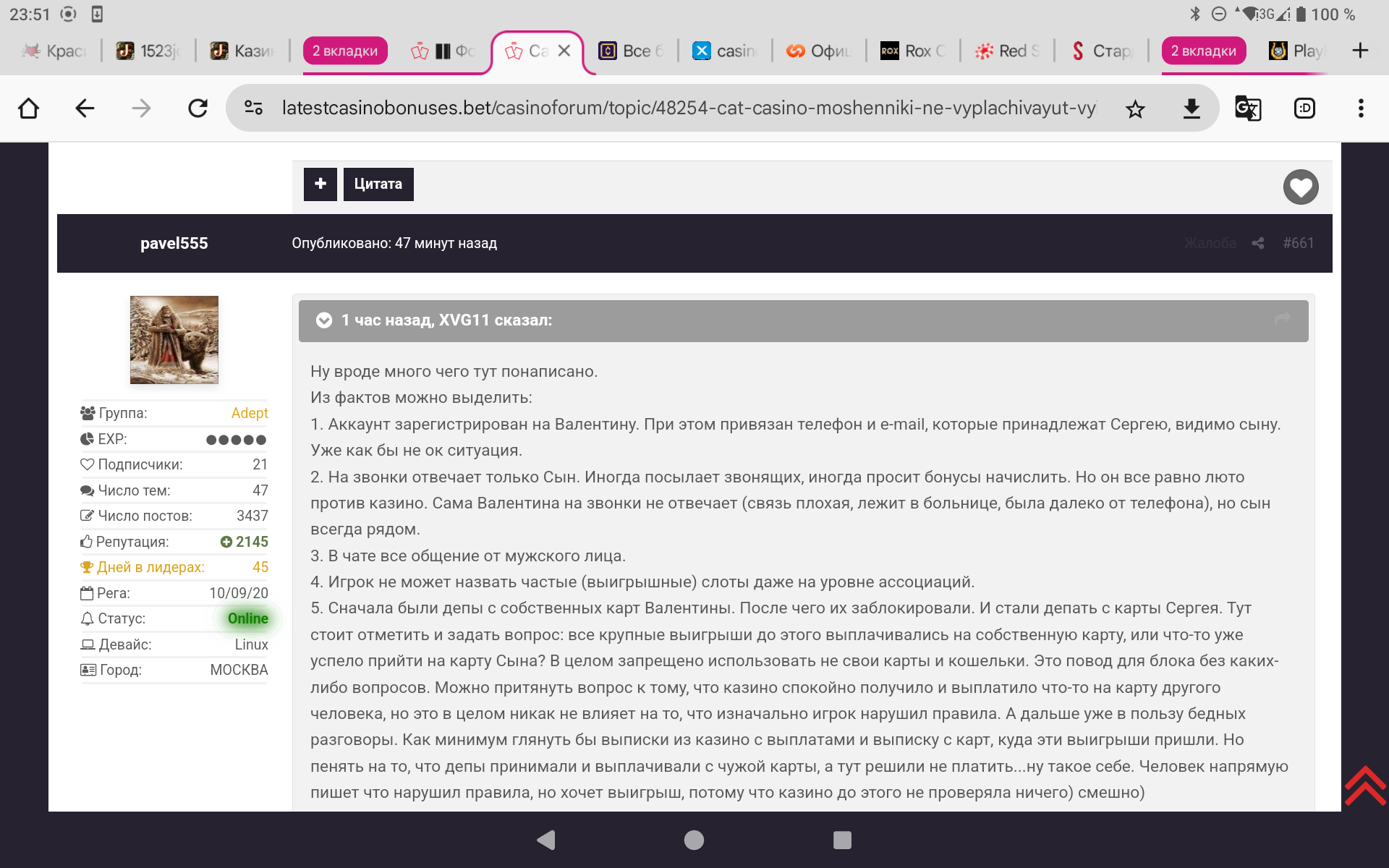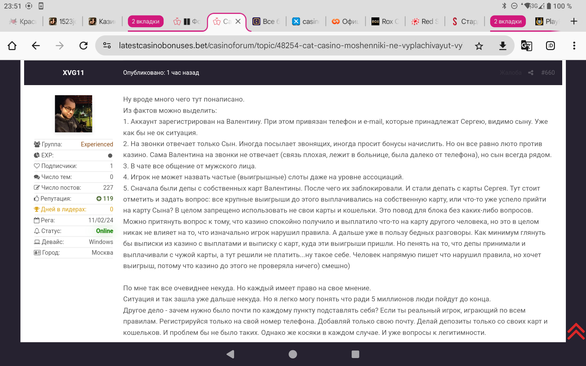 Мы учтем данный ньюанс друг наш!!!100% правильная и точная мысль!!!Также Валентина Федоровна предоставила нам выписки из своих он лайн банков, которые 100% подтверждают ее депозиты и выводы в так называемое Catcasino и ее честную игру,мы приобщим данные доказательства во втором,завершающем видео по данной ситуации !!!Одно нам ясно на данный момент всем,Кэт неказино продолжает придерживаться Мошеннической позиции и не желает Выплачивать честно выигранное нашему игроку из Поволжья Валентине Федоровне,очевидно это основной тренд и кредо работы самого Кэт(не)казино и всей их сетки ,а это,если кто то не знал или позабыл Kent casino,Daddy casino,Gamma casino,R7 casino,Arkada casino,Cometa casino