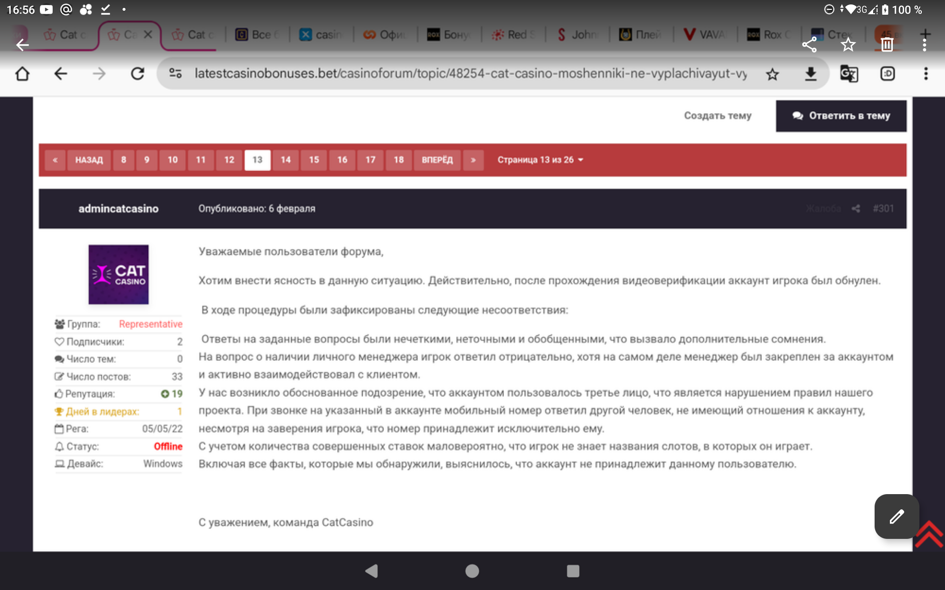 Здравствуйте.Пострадавший игрок Валентина Федоровна,которого кэтказино Кинуло на выплату в 5.4 миллиона рублей сейчас опять в больнице,мы ждём,когда она вышлет нам дополнительные доказательства в виде выписки с он лайн банкинга,которые дополнительно докажут депозиты и выводы ее в данный Скам ресурс!!!!!!Также готовим как вариант подачу исчерпывающей информации в лицензирующий орган GCB по переходному сертификату которого собственно и продолжает функционировать вся сетка скот неказино и ее остальных Скам подобных ресурсов !Уверены,что здравомыслящие,честные и достойные,а также понимающие и сочувствующие данной ситуации игроки все для себя поняли и однозначно пройдут мимо любого ресурса от сетки кэт(не)казино,а также дадут совет игнорировать их другим игрокам.