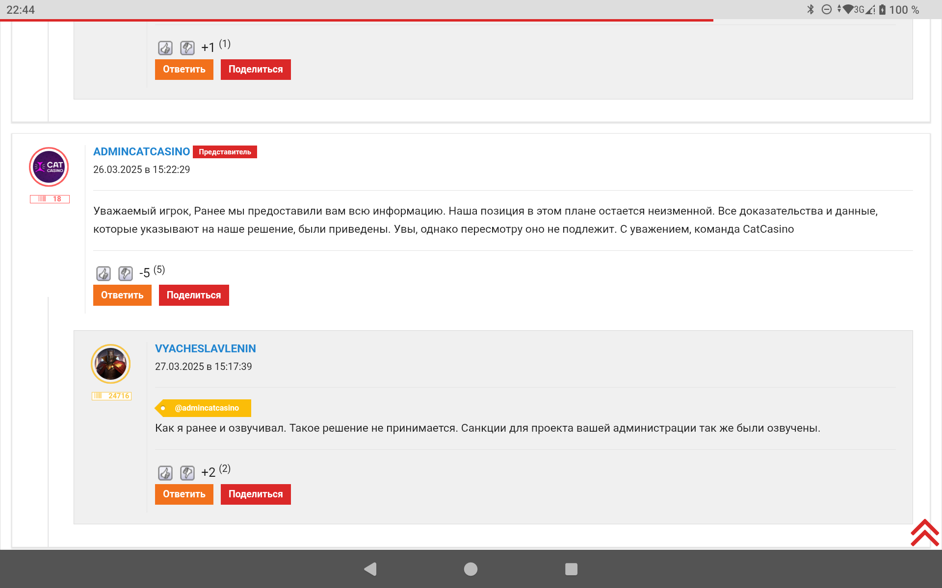 Добрый вечер всем участникам форума, добрый вечер, уважаемый Вячеслав! Прошу прощения, что долго не появлялась на форуме. Перенесла серьезную операцию. Не дождалась выплату от казино. Семья собирала на операцию и лечение, заняли больше миллиона. Сын заложил машину. Все прошло успешно, иду на поправку, но предстоит ещё лечение и реабилитация. До сих пор в больнице. Сегодня увидела ответ от казино. Сказать что я в шоке, ничего не сказать. Тянули время 3 месяца, собирали деньги с глупых людей, кто до сих пор играет в их сети казино. И по итогу отказали. Вячеслав, со всем уважением к Вам, к тому что Вы делаете, почему их сеть казино до сих пор не в чёрном списке? Почему они до сих пор обманывают честных игроков? Им плевать на Ваш авторитет, на Ваши решения, которые принимаются взвешенно и как Вы говорите тщательно разобрав ситуацию. Вы лицо форума, главный арбитр, а администрация какого недоказино так пренебрежительно относится к Вашему решению. Я требую, чтоб вся сеть кэт казино, все казино, относящиеся к ним Вы внесли в чёрный список. Количество недовольных игроков, оставляющих жалобы на форуме растет на данную сеть казино, но от Вас только угрозы, действий нет. Они это поняли и собирают дальше денежки с простых смертных. Прошу всех игроков поддержать меня в данной ситуации!!! Хватит угроз в их сторону, давно пора переходить к действиям! Очень хочется, чтоб каждый игрок, посещающий этот форму знал, что это мошенники и рассказал всем своим знакомым и друзьям, кто, возможно, играет! Я несколько раз писала им в чат поддержки по поводу решения Вячеслава на форуме. Они ответили, что в курсе ситуации и что ждите ответа в жалобе. Через 2 недели ответили отказом. Одним словом- мошенники! Все ответы затягиваются сознательно, чтоб срубить как можно больше денег. Прочитала про возможность блокировки их карт для переводов. Полностью поддерживаю и прошу участников форума поддержать эту инициативу. Может после этого они за шевелятся и начнут думать! Спасибо всем кто поддерживает меня. Они может подумали, бабка померла после операции — не дождетесь!!!