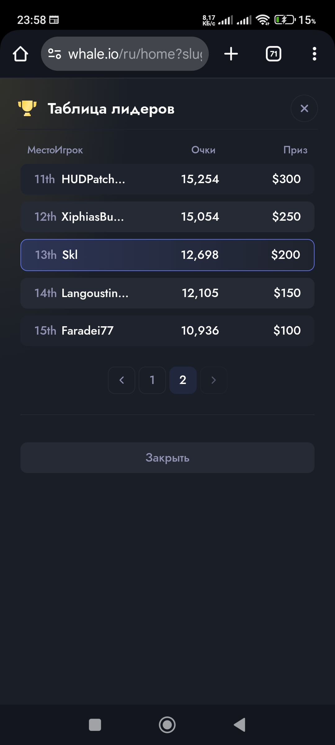 Короче вчера такая ситуация приключилась, остаётся час до конца турнира, призовых 15 мест, ну я прикинул, думаю обойдут полюбому, максимум зайду за час до конца и чекну. Захожу показывает на 15 месте, но понимаю, что могу часик поиграть и может место удержу, прикинул, подумал, меньше минуты, лудка съела просто и закинул 300 баксов, крутил ровно час, до полуночи, то есть конца конкурса не пропуская ни один спин. В итоге чудом баланс сохранился, даже чуть на пиццу поднял. Но прикол был в том, что был лайт на 34 на 200 иксов, выпадет 34 иксовка, но в списке отображения номеров его не добавляют, все начали возмущаться, у кого то норм суммы были поставлены. Ведущий говорит пишите в техподдержку, в чатике верните выигрыш, короче в итоге спустя минут 20 сумму выигрыша добавили к балансу, но факт в том, что число не внесли в список как обычно видишь выигрыши. То есть, открытый системный скам, который пошел не по графику. А по поводу турнира, вроде пишет выиграл 200$ но ждать 48 часов, интересно начислят или нет, скрины я сделал, но на whale этот турнир уже найти не могу, нету вкладки предыдущие или я на столько слепой, но интересно накинут или нет