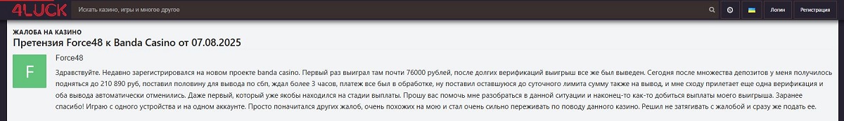 /casino-complaints/vyplaty/otmenennaya-vyplata/banda-sasino-07-08-2025-zaprosili-povtornuyu-verifikatsiyu-na-210-890-rub/