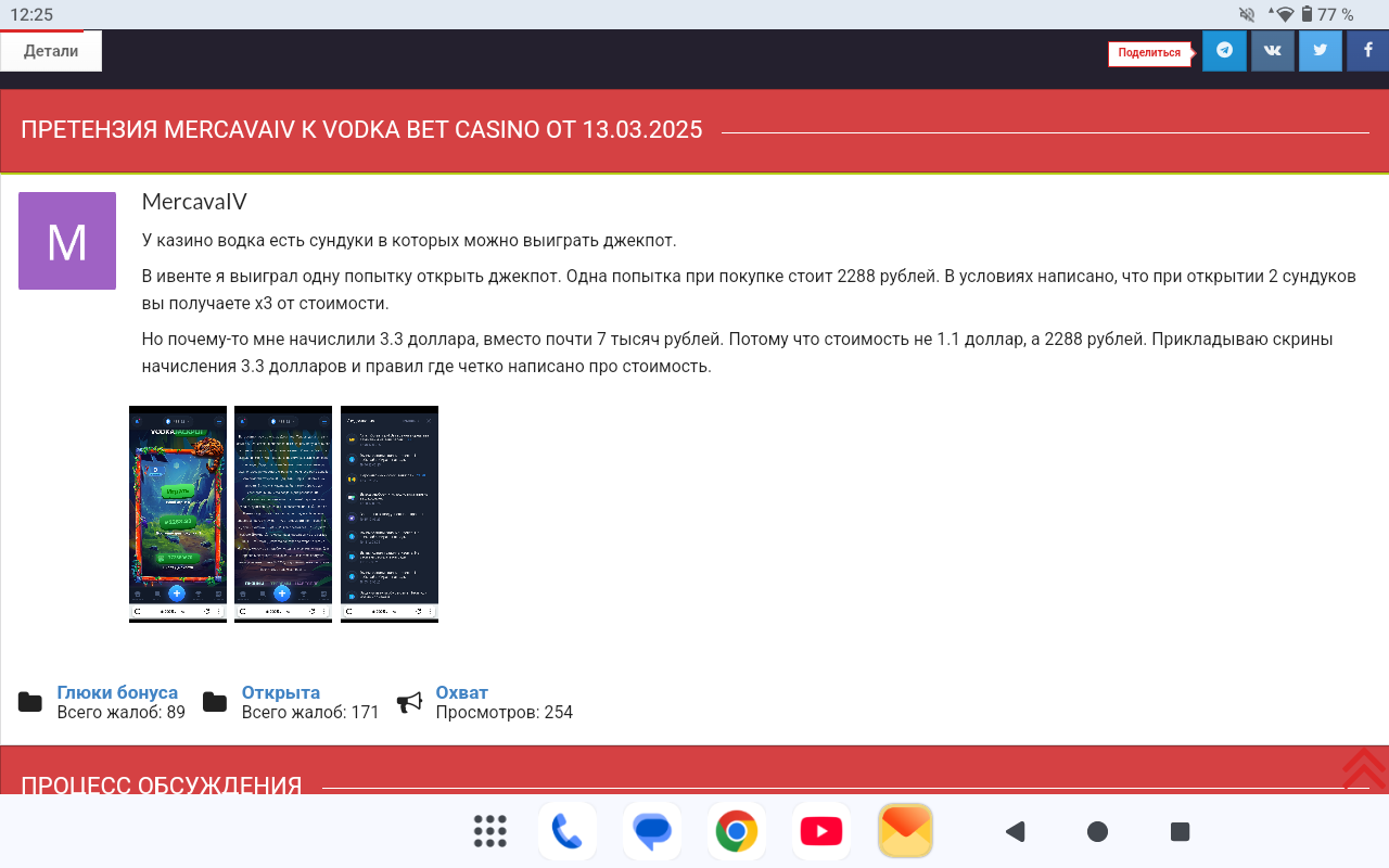 А теперь математика: в ивенте приняли участие больше 10 тысяч активных игроков, попытка в джекпот была не настолько редким призом. Поэтому могу предположить, что минимум одну тысячу игроков казино водка заскамило аналогичным образом. Следовательно, по самым скромным подсчётам казино водка во время ивента заскамило своих игроков более чем на 5 млн. рублей.
