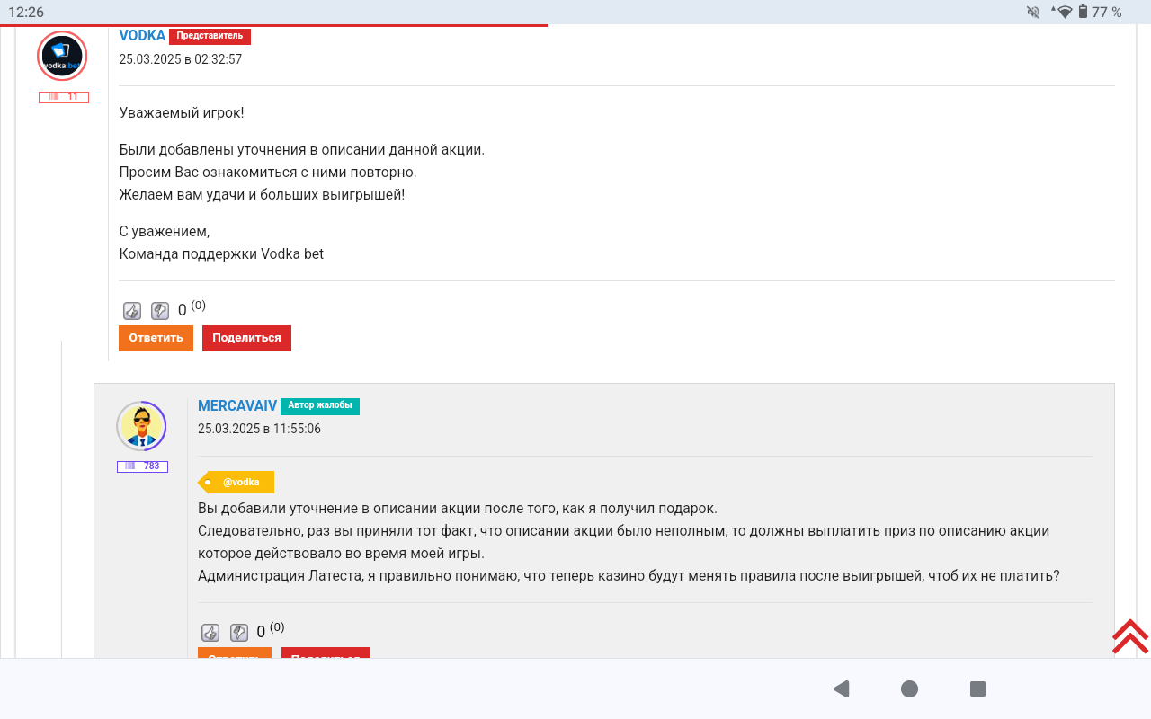 Жалоба в казино: по данной ошибке в призах была написана жалоба, в ходе решения которой казино признало факт того, что правила указанные изначально были неполными и внесли их корректировку. Однако, выплачивать приз по правилам действующим во время ивента они категорически отказываются. Получается, казино водка изменила правила после выигрыша, чтоб его не выплачивать.