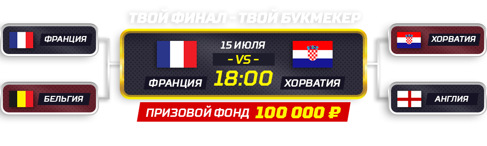 Мы не могли остаться в стороне и не ознаменовать финал Чемпионата мира грандиозной акцией, поэтому мы наградим авторов самых успешных ставок и разыграем 100 000 тысяч рублей!