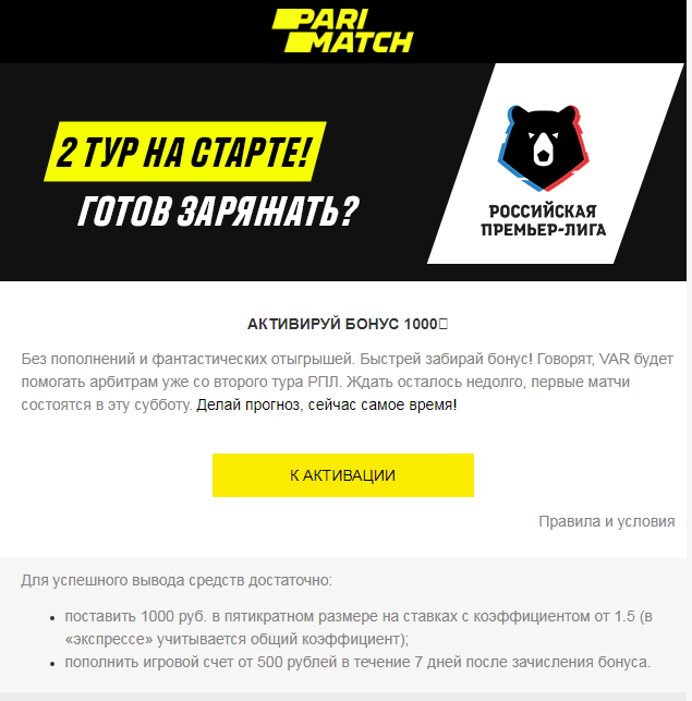 проверяйте почту, акция от париматча, возможна индивидуальна, проставить х5 от 1к рублей, и внести депозит 500р в течении 7 дней с активации