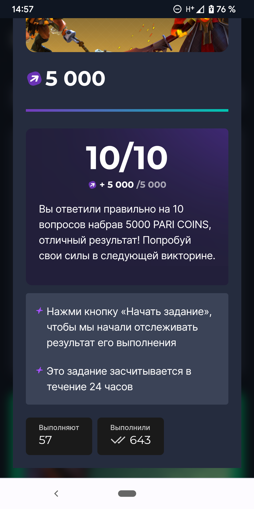 В БК Пари. Проходит какая то викторина, что она даёт пока не разобрался. Но советую пройти, так как возможно дадут какие то фрибеты. Сам ответил на 10 вопрос из десяти.