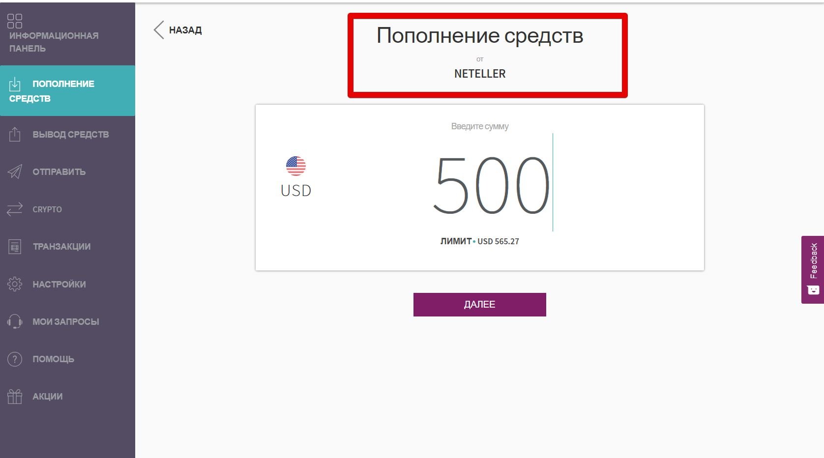 2. На следующей страницу предлагается ввести сумму пополнения вашего Skrill с Neteller (лимит на перевод — 565,27 дол). Вводим, нажимаем Далее: