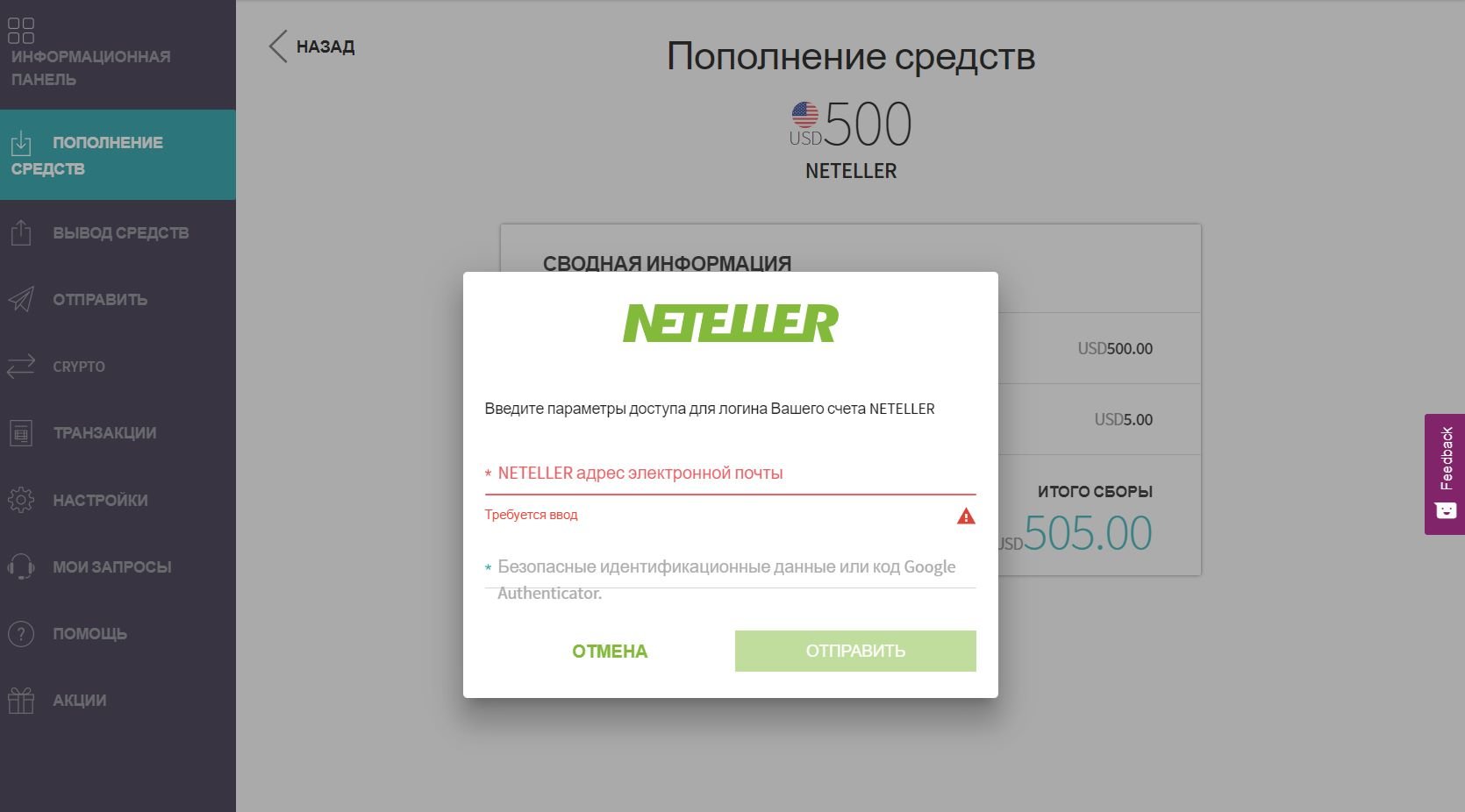 4. Во всплывающем окне вводим данные Нетеллер-кошелька и нажимаем Отправить. После этого вводим код из Гугл аутентификатора: