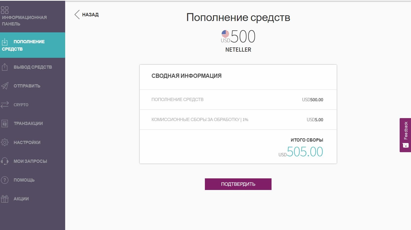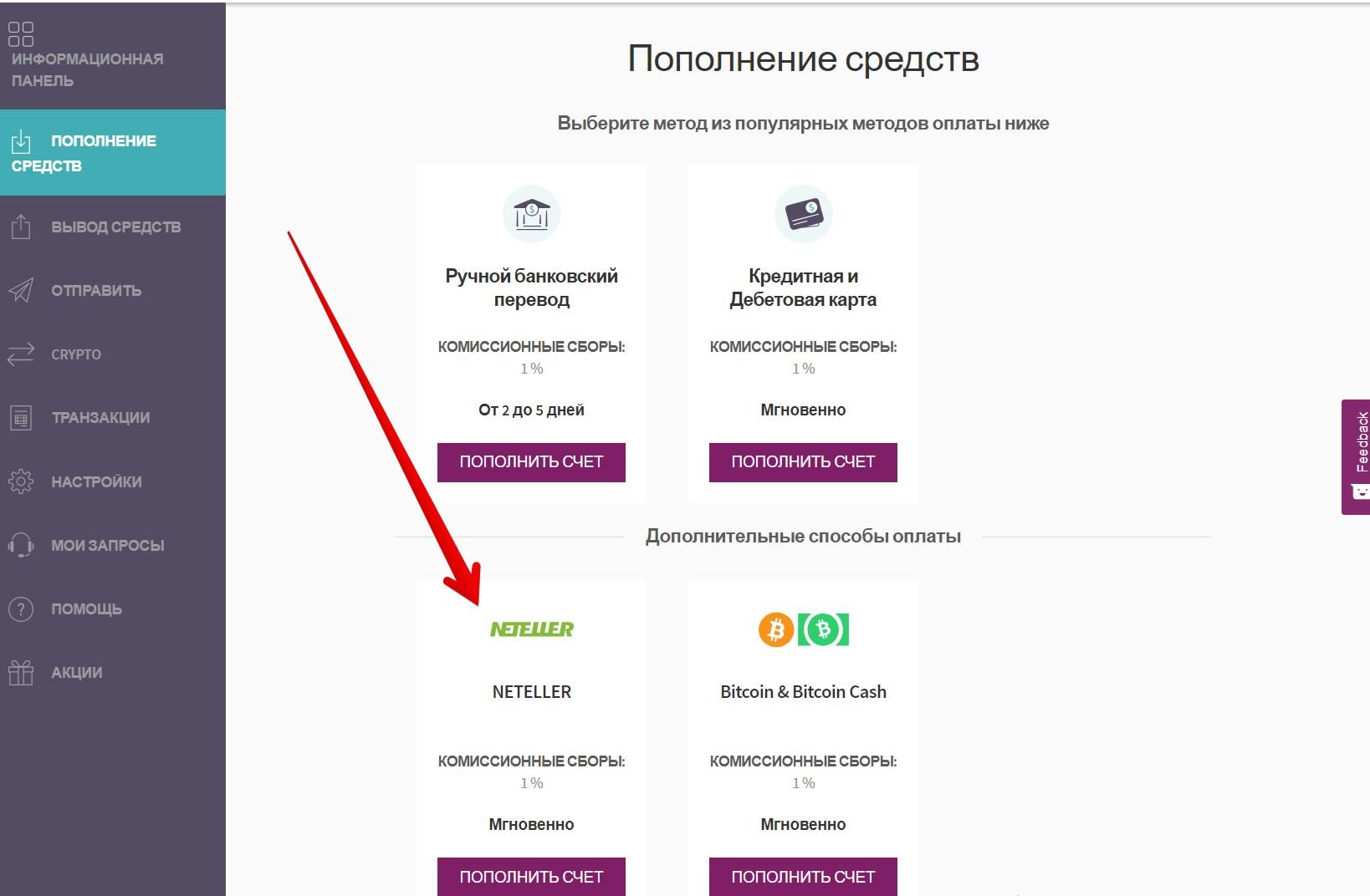1. В аккаунте переходите на вкладку Пополнение. Нас интересует блок Neteller, нажимаем на кнопку Пополнить счет: