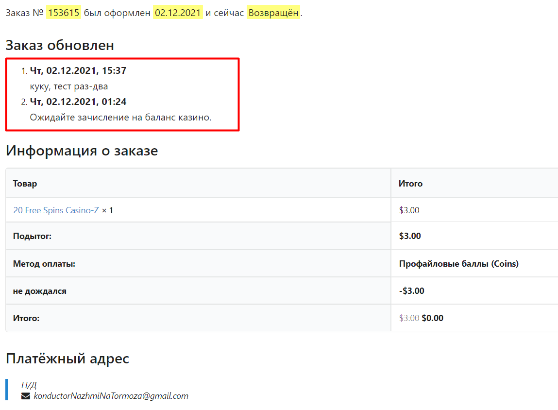 Помимо того что заказ выполнен, в заказе есть комментарий. что начисдят на аккаунт в казино