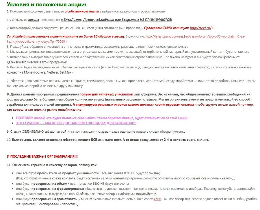 К тому же это не значит, шо все кто написал отзыв на игру или на казино, получат вознаграждения. там много «но»… «Но», которые надо выполнять и не только по объему(1500 знаков)… Изучайте условия и положения