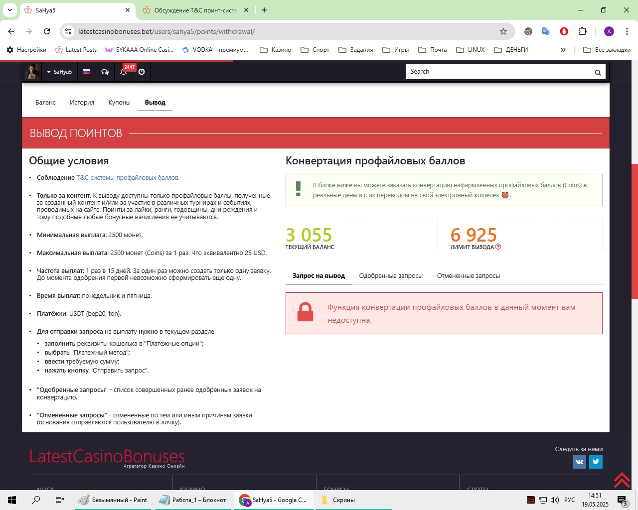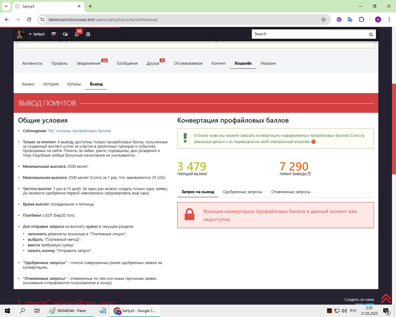 Конвертация баллов в данный момент недоступна для вашего профиля! Все новые пользователи не могут конвертировать баллы в течение первых 3 месяцев после регистрации. Также ознакомьтесь с правилами и условиями №4 пункт 8 , где указано условие обязательных покупок в магазине между заявками на вывод.