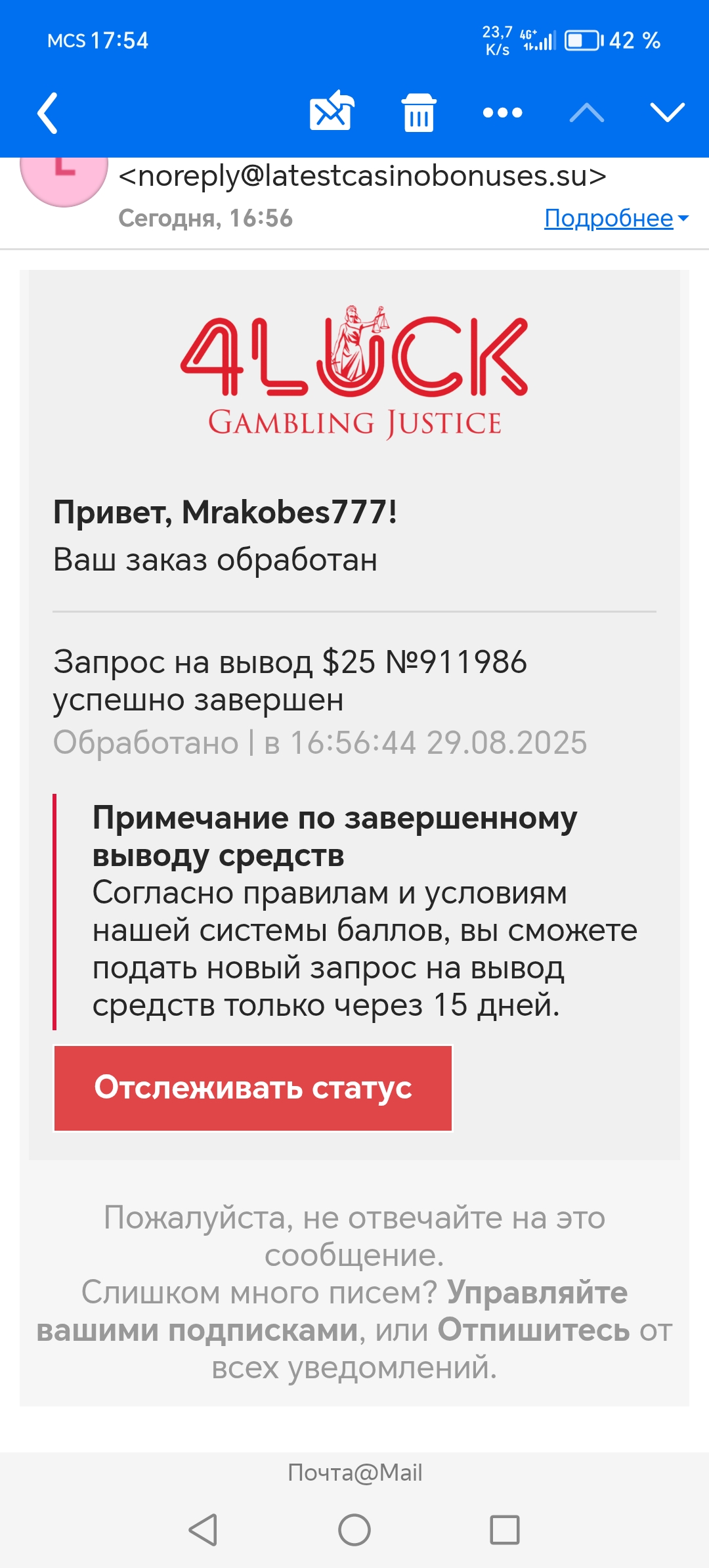 Ребят пришло письмо что вывод успешен, но в кошельке пусто. Прошёл час с момента письма