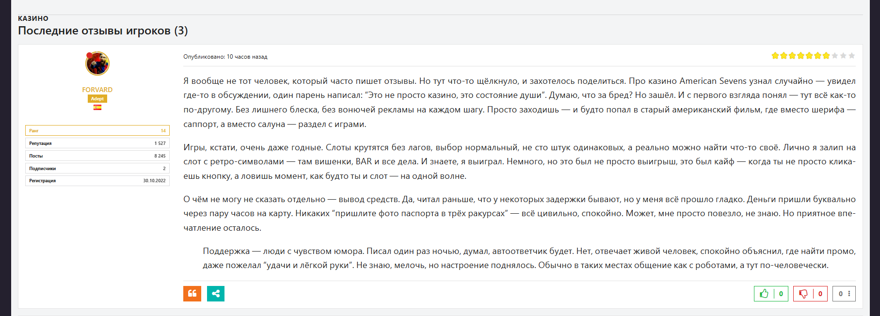 Раньше как то не обращал внимания, сейчас зашел отзывы посмотреть и среди первых попался отзыв на казино Next, тип даже уже с названиями не заморачивается, впарил туда отзыв на какое то американ севен)) и так пойдет! ахааа