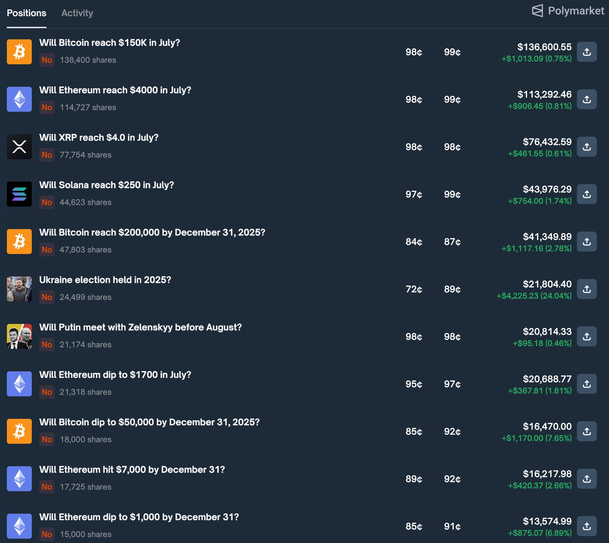 Американец заработал $255 489, делая ставки на то, что события не произойдут. Пользователь Polymarket под ником Olololo угадал, что в июле BTC не дойдёт до $150 000, ETH не пробьёт $4000, Путин не встретится с Зеленским, а Solana не вырастет до $250.