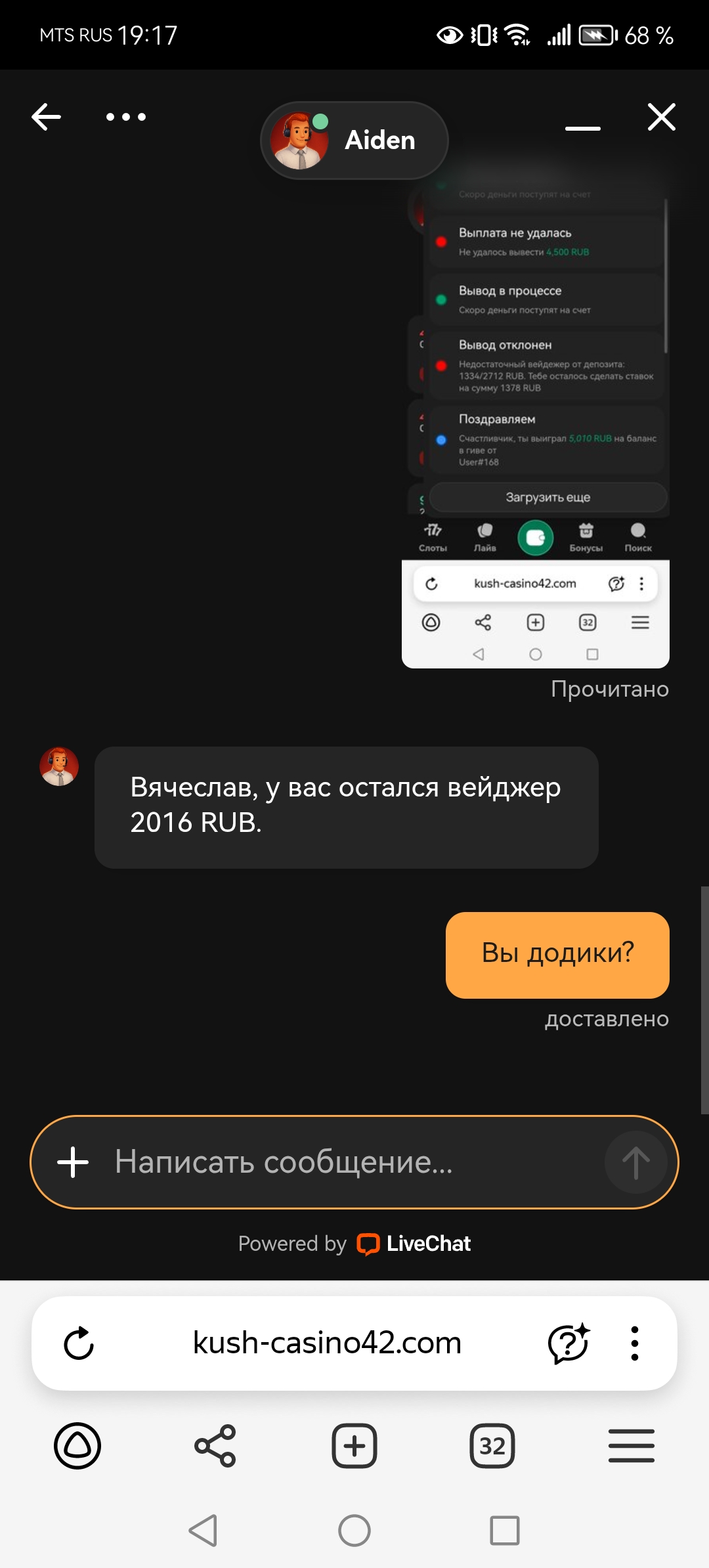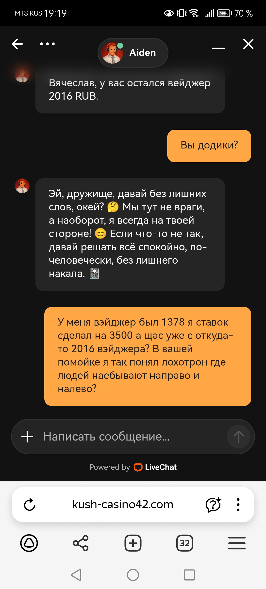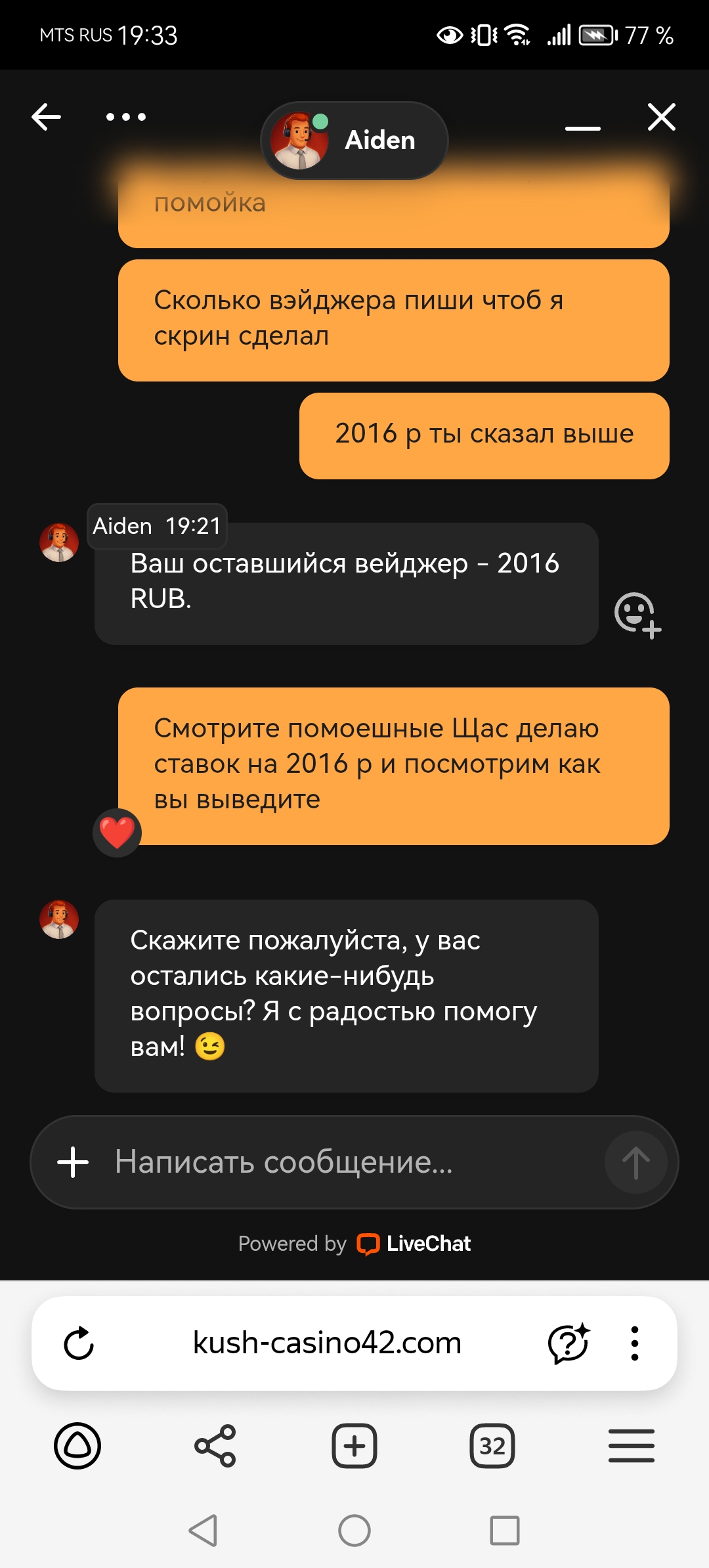 @galisar так потом еще и не выведут 🤣 я вериф прошёл, тут играл недавно решил вывести они мне начали говорить у тебя вэйджер 1400 не откручен, я пошел поиграл еще 3500, ставлю остатки на вывод снова отмена пишу почему? А они говорят у тебя вэйджер уже 2016 🤣 то есть ты деньги проигрываешь и вэйджер растет 🤣🤣 скрины щас прикреплю! Не играйте в этой помойке