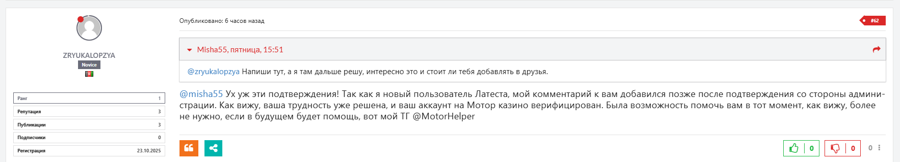 @misha55 Ух уж эти подтверждения! Так как я новый пользователь Латеста, мой комментарий к вам добавился позже после подтверждения со стороны администрации. Как вижу, ваша трудность уже решена, и ваш аккаунт на Мотор казино верифицирован. Была возможность помочь вам в тот момент, как вижу, более не нужно, если в будущем будет помощь, вот мой ТГ @MotorHelper