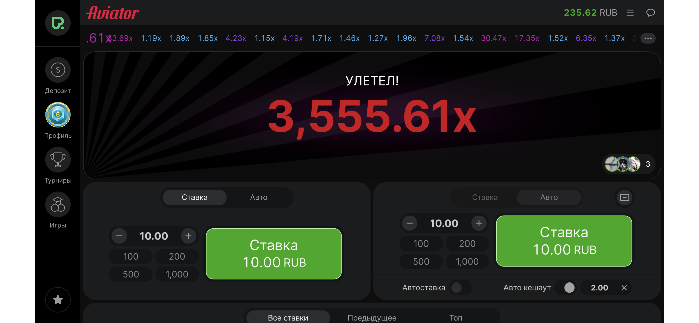 @robingood игра психологически высчитан так что иксов огромных не будет! Да, они будут, но любой человек даже дойдя до х1000, ну точно снимет, а там вполне может до х5000 долететь. И это так я по максимуму беру, а по большому счёту даже х100 уже будут забирать. Он честно работает, просто создатели прекрасно понимая психологию человека могут спокойно делать так чтоб самолёт далеко и часто улетал, ничего страшного, 99% игроков снимут копейки, до этого нормально слив.