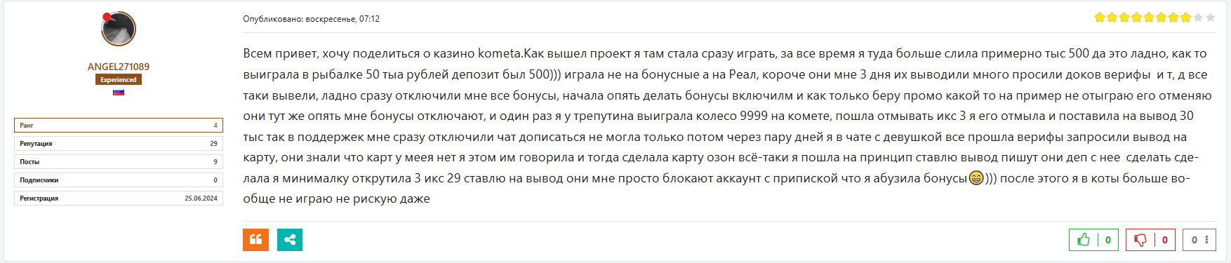 Увидел такой казик, зашел почитать отзывы, так как форум себя позиционирует реальными отзывами от настоящих игроков, значит можно доверять, регаться и играть. А там просто накрутка была на банду, мол топовый каз, верификация не нужна, любые выплаты и тд. Человек идёт туда, выигрывает условно лям и его верифицируют 2 недели, а потом еще платят месяц и это в лучшем случае. В худшем будут как некрасивый.
