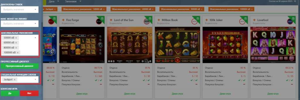 Выбрав в списке особых функций «джекпот», игрок не всегда получит желаемого результата, так как есть немало слотов с заявленной характеристикой, но выигрыш в них не превышает 5 000 ставок. Для поиска не помешает установить более детальные значения в графе «Максимальные умножения».