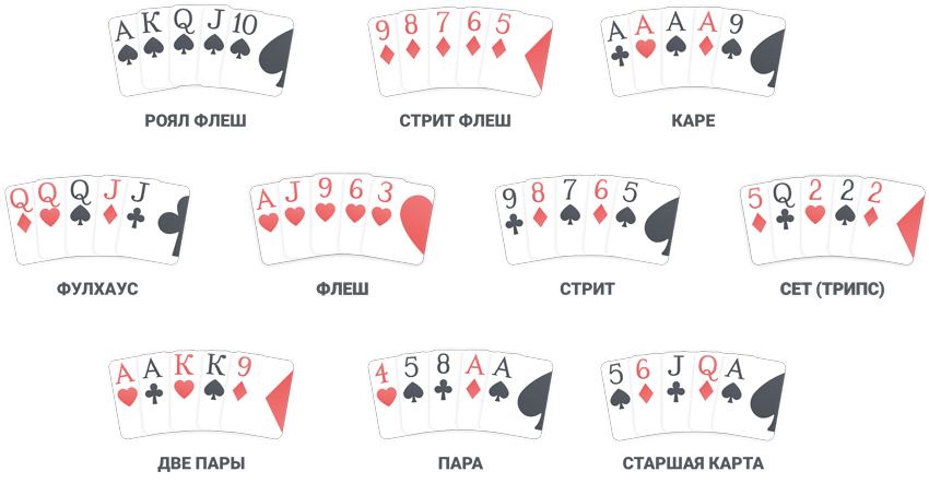 Для пятикаточного покера, стада, холдема, омахи, если речь не идет о каком-то особом подвиде игры, перечисленные вариации карт будут общепринятыми. Поэтому, если вы только осваиваете игру и еще не запомнили все комбинации, то можете записать их в качестве шпаргалки.