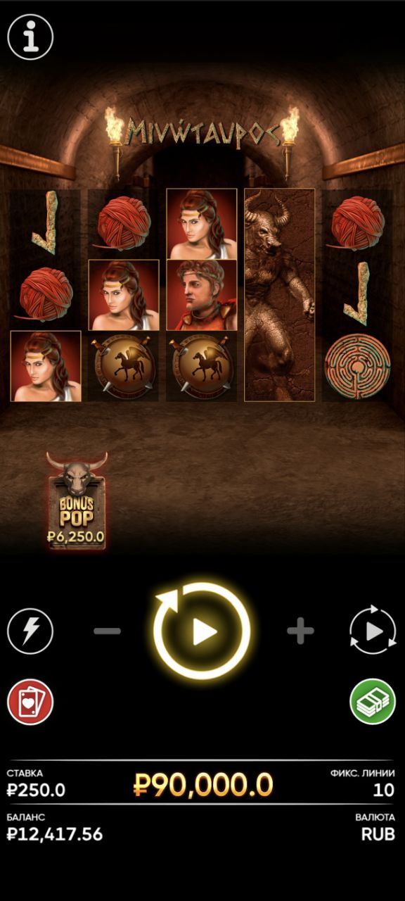 Иногда бывает, что появляется сам Минотавр. Он не страшный, а скорее загадочный. Когда он появляется, он может принести что-то хорошее, например, увеличить выигрыши. Это как если бы ты встретила хранителя лабиринта, который показывает тебе путь к кладу. А еще он мне насыпал аж 250х, это вау!