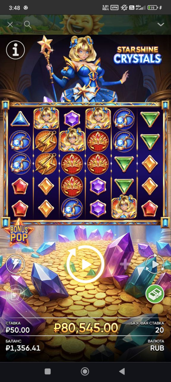 Всех приветствую!!! Всем доброго времени суток и хорошего настроения. Поделюсь своим опытом с слота Starshine Crystals от провайдера Endorphina. Данный видеослот вышел не так давно, двадцать пятого апреля две тысячи двадцать пятого года.Данный видеослот относится к каскадным слотам,с шансом выигрыша икс десять тысяч от вашей ставки. У данного слота не плохая динамика и графическое исполнение.В данном видеослоте есть два вида покупной бонусной игры,икс сто сорок девять от вашей ставки (обычная) и вторая топовая за икс четыреста девяносто семь от вашей ставки, в топовой бонуске минимальный множитель икс начинается с икс шести, в обычной с икс двух, так что как по мне не особо выгодное предложение покупать топовую бонуску, да в ней конечно как-то чаще падайте иксы, но и потери у вас баланса тоже могут быть не малые. Приложу вам скрин недавнего заноса в одном из новинок это эндорфины. На этом скрине обычная бонуска, там выпала иксовка икс двести пятьдесят, так что максимальный икс возможен и с обычной бонуски, но всё же и обычная тоже дорогая как по мне, так что крутим ребята и ловим так бонусы))). Всем добра и никаких замазок.