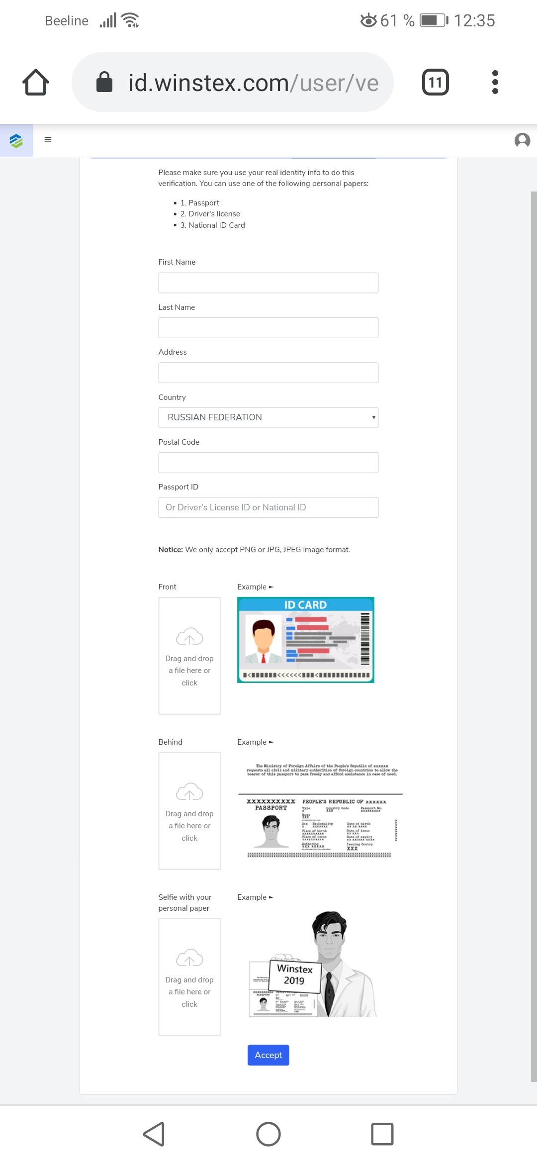 Для верификации нужно загрузить права (если есть) разворот паспорта с фото, фото паспорта где прописка и селфи с ним и картинкой Winstex 2019! Все поля для вставки фото должны быть заполнены