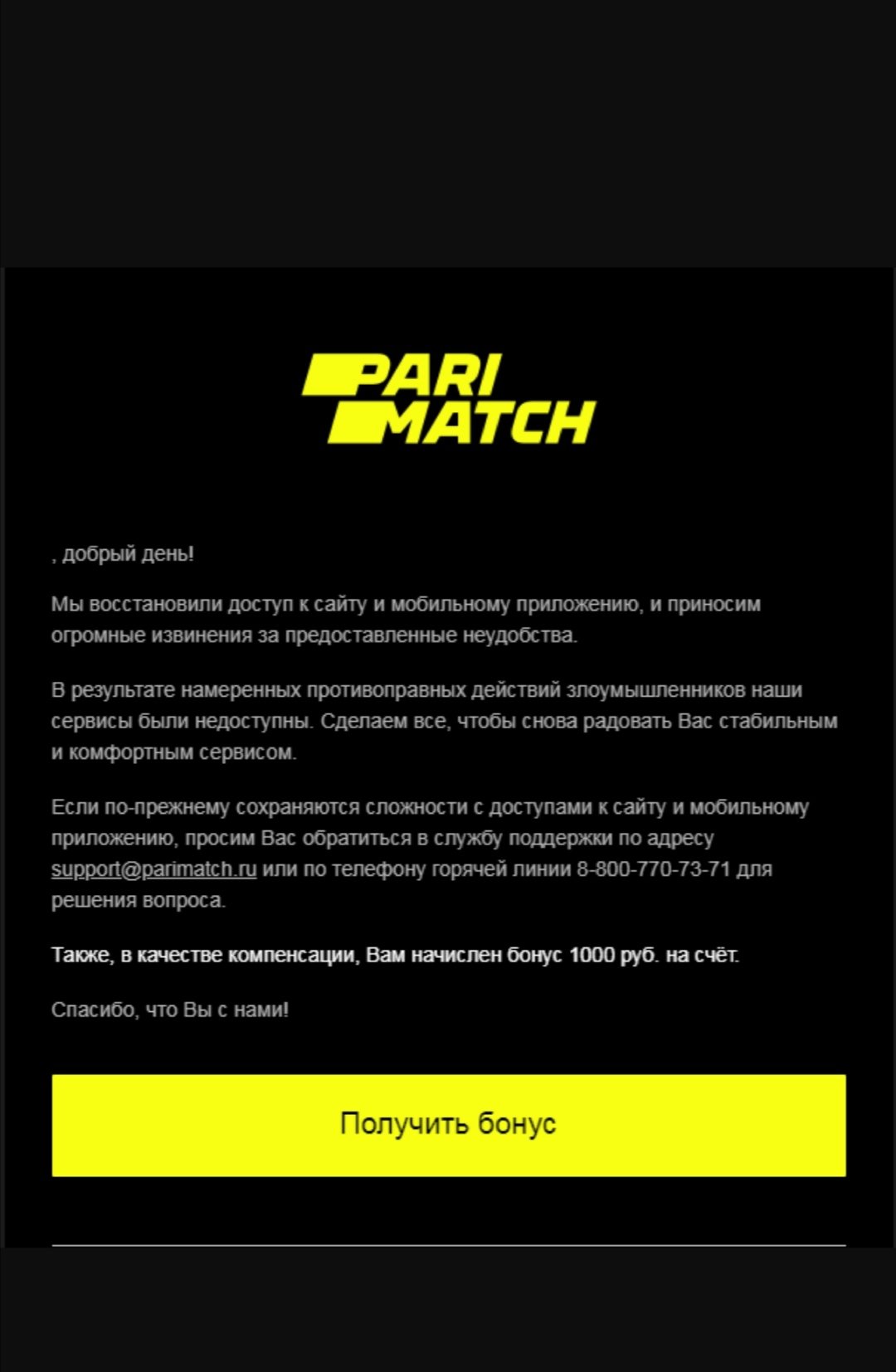 От париматч ру некоторым пришли такие письма… Мне не пришло, я обратился в онлайн чат у них сайте по вопросу зачисления мне бонуса из-за перебоев в работе сайте и приложения… .. Оператор уточнил номер счета и сообщил, что для оперативного начисления бонуса информация передана специалистам