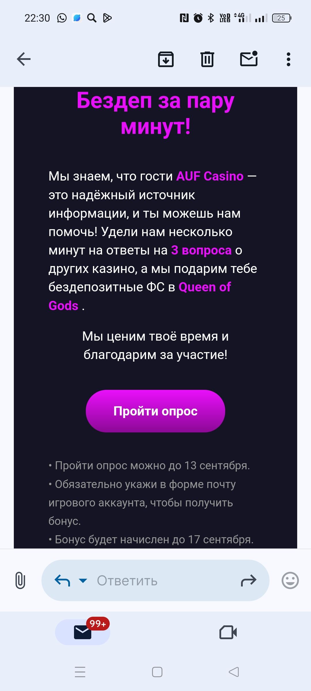 На почту с Aуф пришло. мол 30 фрих дадут за опрос.