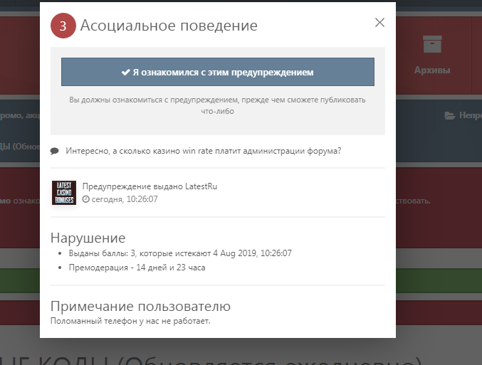 вот это предупреждение объясните. причем тут сломанный телефон и поведение асоциальное??? незаконно забаненый пользователь пострадавший от казино которое вы всем форумом покрываете попросил последний раз донести свою позицию для форумчан. это заслуживает бана? почему пометку ему не сделали и в тему не написали про забаненых что SAVARUS забанен перманентно?