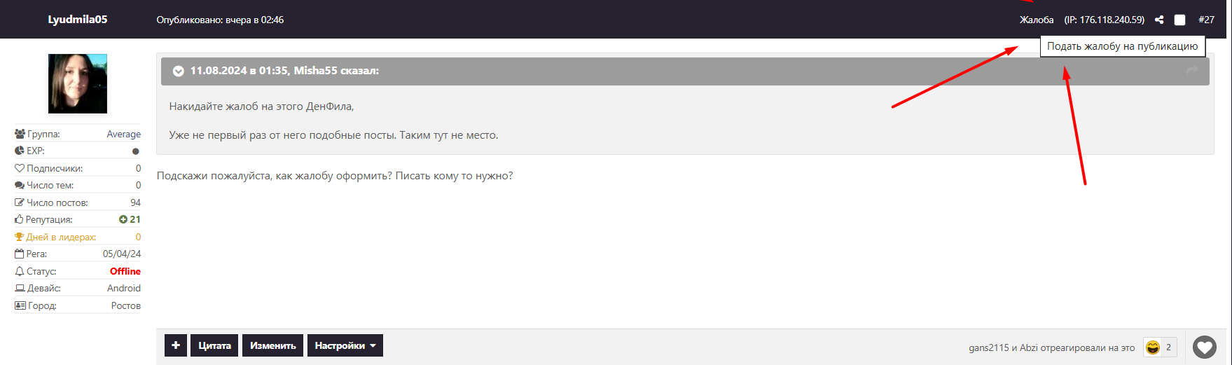 Если вы не согласны с постом на форуме, можете оставить жалобу, как указано на скриншоте!