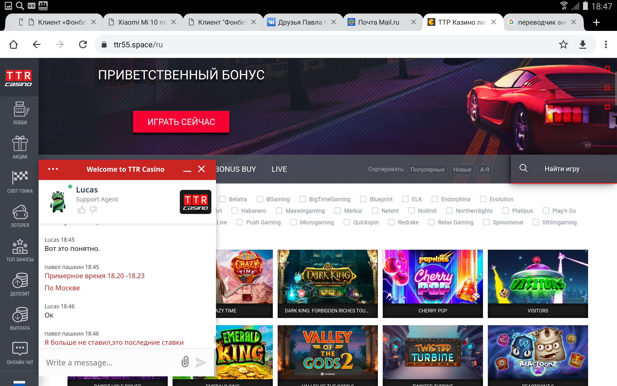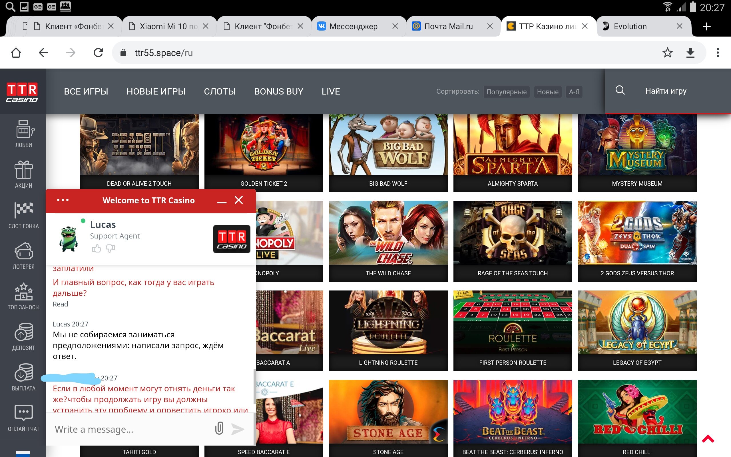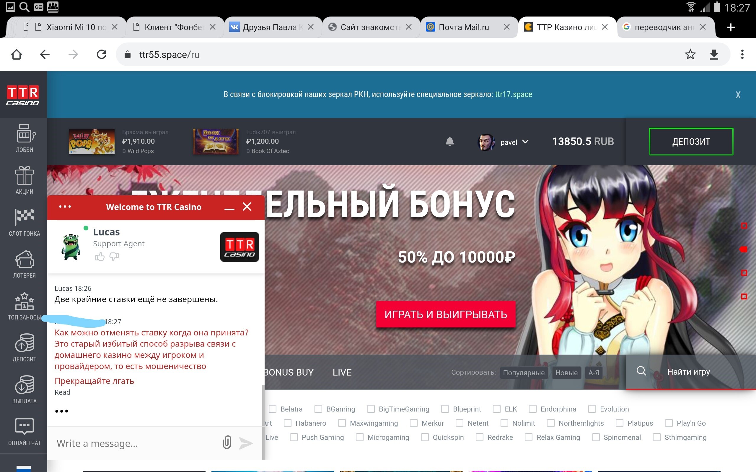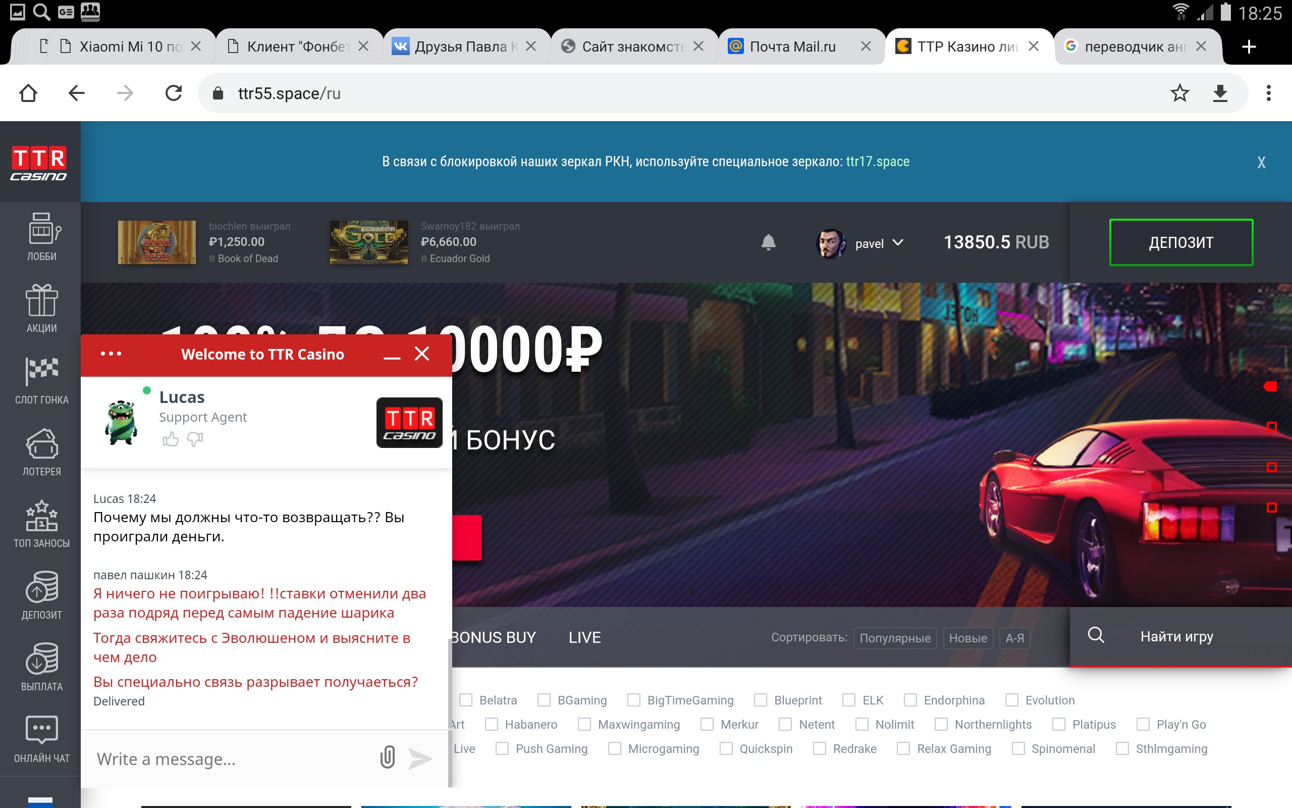 МОГУ ТОЛЬКО ПОРАДОВАТЬСЯ ЗА ЛАТЕСТ И ПОЗДРАВИТЬ ВАС ЛИЧНО!СЧИТАЮ ЭТО БООООЛЬШИМ ДОСТИЖЕНИЕМ!ВОТ СЕЙЧАС ПОИЩУ ВИДЕО И СКРИНЫ ГДЕ МНЕ ТТР КАЗИНО ШЕЙВАНУЛ ДВЕ ОТМЕНЫ СТАВКИ ПОДРЯД В НОМЕРЕ 29 В РУЛЕТКУ ЭВОЛЮШЕН!ТАКОГО БЕСПРЕДЕЛА БОЛЬШЕ НИГДЕ НЕ ВИДЕЛ КРОМЕ РИО НО ТАМ ПЛАТФОРМА ДРУГАЯ И БЫЛО ТО ГОД НАЗАД ПОСЛЕДНИЙ РАЗ.ВСЕГО ТО 10 ЕВРО СТОЯЛО В НОМЕРЕ И СТАВКА ВРОДЕ 4600 В РУБЛЯХ ЗА СПИН (А ИГРАЮ Я КРУПНО ПОВЕРЬТЕ ВИДЕО И СКРИНЫ ВЫШЛЮ КОГДА СКАЖЕТЕ) И 2 ВЫПЛАТЫ ПОДРЯД ЭТО 44 К РУБЛИКОВ ДЕРЕВЯННЫХ!САППОРТ ТТР ТАКТИЧНО ПОСЛАЛ МЕНЯ КУДА ПОДАЛЬШЕ НО ПРИ ЭТОМ ОНИ ЧЕТКО ПОДТВЕРДИЛИ ЧТО ХА-ХА МИЛЛИАРДНЫЙ ПРОЕКТ ЭВОЛЮШЕН ЛИЧНО!А НЕ ОНИ ТТР КАЗИНО ОТМЕНИЛ ДВА!РАЗА ПОДРЯД МОИ СТАВКИ ПРЯМО ПОСЛЕ ПАДЕНИЯ ШАРИКА В НОМЕР 29 А САМ!АНДРЕЙ ЭТОТ ВЕЛИКИЙ ЧЕЛОВЕК КОТОРОГО МЫ ВСЕ УВАЖАЕМ ЗА СПРАВЕДЛИВОСТЬ ДАЖЕ СПЕЦИАЛЬНОЕ ВИДЕО НА ЮТУБЕ ВЫЛОЖИЛ ГДЕ СКАЗАЛ ЧТО Я НЕУМНЫЙ ЧЕЛОВЕК ЕСТЬ И ЗАФЛУДИЛ ЕГО КАНАЛ(РАЗУМЕЕТЬСЯ ВСЕ МОИ КОМЕНТЫ ОН УДАЛИЛ ЧТОБЫ ДРУГИМ БЫЛО НЕ ПОВАДНО)ВООБЩЕМ Я ИЩУ ВИДЕО НО СКРИНЫ 100 % Я С НЕГО ВСЕ!СНЯЛ И ОНИ В ОТДЕЛЬНОЙ ПАПКЕ ЧЕТКО ПЛЮС ПЕРЕПИСКА С САППОРТОМ И МОЙ ДИАЛОГ С АНДРЕЕМ В ЕГО ЮТУБ КАНАЛЕ!ВОТ И ПОСМОТРИМ КАК УВАЖАЕМЫЙ МНОЙ (БЕЗ ПРЕУВЕЛИЧЕНИЯ!СЧИТАЮ ЧТО ЛАТЕСТ ЭТО ОЧЕНЬ ХОРОШО ЧТО ЕСТЬ!)ПОМОЖЕТ МНЕ РЕШИТЬ КИДОК ГОСПОДИНА ТТР В ОТНОШЕНИИ МЕНЯ.