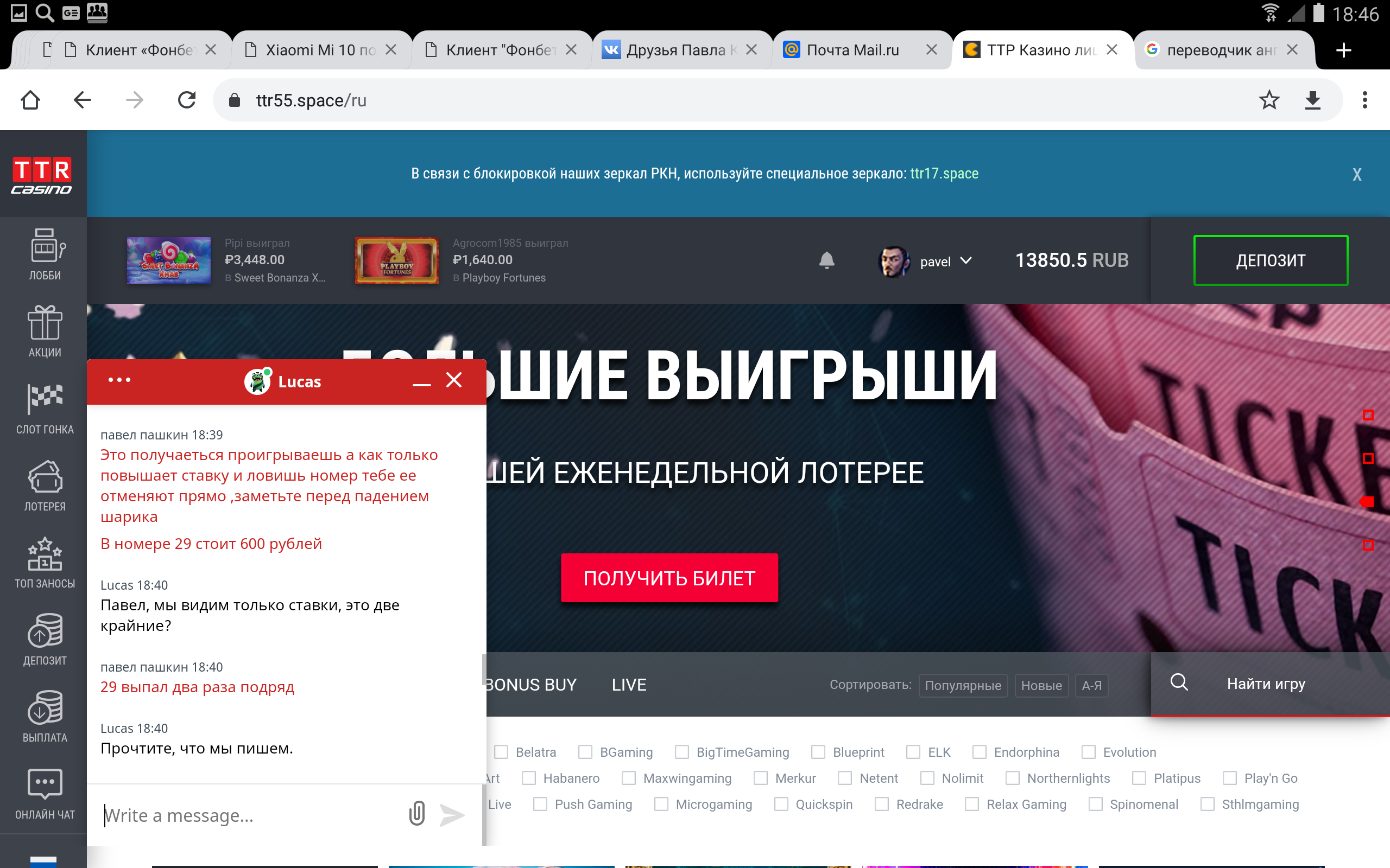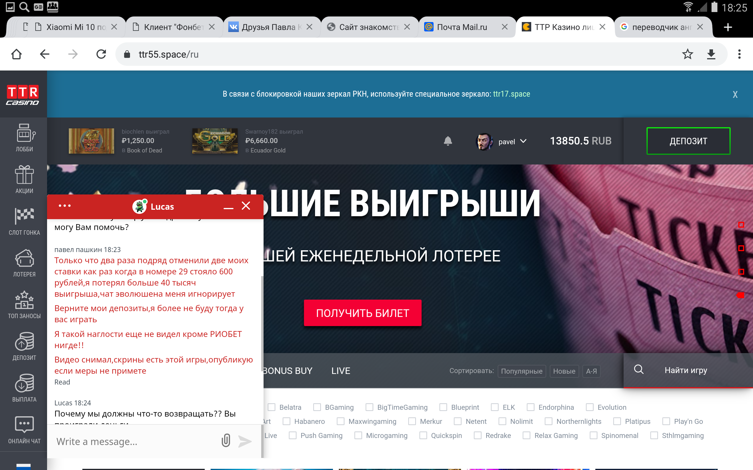В ОКТЯБРЕ ПРОШЛОГО ГОДА ИГРАЯ В ТТР КАЗИНО СДЕЛАЛ ДВЕ СТАВКИ ПОДРЯД В ЛАЙВ РУЛЕТКУ ОТ ЭВОЛЮШЕН И МНЕ ДВА РАЗА ПОДРЯД ОТМЕНИЛИ ВЫПЛАТУ В НОМЕР 29 В КОТОРОМ СТОЯЛО 600 РУБЛЕЙ!( ОБЩАЯ СТАВКА 4600 ЗА СПИН И БОЛЕЕ ТЫСЯЧИ ДОЛЛАРОВ ЗА ВЕЧЕР СЕССИЮ.УСПЕЛ СЛИТЬ ОКОЛО 300 К вечных российских рублей ЗА НЕДЕЛЮ ДО ЭТОГО в этом ттр ке казино на ВАШЕЙ ПЛАТФОРМЕ И ЗАСТАВИЛ СЕБЯ ОСТАНОВИТЬСЯ ПОСЛЕ ЭТОГО СЛУЧАЯ.И НЕ ЗРЯ.ИГРАЮ ОЧЕНЬ КРУПНО И ЖЕСТКО ДА ВЫ И САМИ ПО МОЕМУ АККУ ВСЕ УВИДИТЕ СРАЗУ И ВОТ ЧЕРТ ЗАНЕС МЕНЯ «ПОПРОБОВАТЬ»ЧЕСТНЕЙШЕЕ КАЗИНО ОТ САМОГО ТТР а!!СКРИНЫ С ВИДЕО СНЯЛ НО ВИДЕО К СОЖАЛЕНИЮ НЕ МОГУ НАЙТИ ОЧЕВИДНО НЕ НАЙДУ НО ВСЕ СКРИНЫ ПЛЮС СКРИНЫ С САПОРТОМ ТТР КАЗИНО КОТОРЫЙ СКАЗАЛ ЧТО СТАВКУ МНЕ ОТМЕНИЛ МИЛЛИАРДНЫЙ ПРОЕКТ ЭВОЛЮШЕН ТО ЕСТЬ ДВА РАЗА ПОДРЯД И ИМЕННО МНЕ А ПО СУТИ ВЫ !!!УВЕРЕН НА 10000% ЧТО ТТР ПРОЕКТ НА ВАШЕЙ ПЛАТФОРМЕ ПРОСТО «ШЕЙВАНУЛ»ПОБРИЛ МЕНЯ ДВА РАЗА ПОДРЯД ОТМЕНИВ СТАВКУ ЭЛЕМЕНТАРНЫМ РАЗРЫВОМ СВЯЗИ(ИЗЛЮБЛЕННЫЙ ПРИЕМ НЕЧЕСТНЫХ ПРОЕКТОВ И К ОГОРЧЕНИЮ НА ВАШЕЙ ПЛАТФОРМЕ ОЧЕНЬ СИЛЬНО)УВАЖАЕМЫЕ БРАТЬЯ ИЗ БЕЛОРУССИИ ТО ЕСТЬ САМ СОВТСТСВИСС НА БАЗЕ КОТОРЫХ НАХОДИТСЯ ЭТОТ ПОМОЙНЫЕ ПРОЕКТ. ЖАЛОБУ ГОТОВ РАЗМЕСТИТЬ ПО ПЕРВОМУ ВАШЕМУ ТРЕБОВАНИЮ НЕ РАЗМЕЩАЛ ТАК КАК ИСКАЛ ВИДЕО А ТУТ УВИДЕЛ ЧТО САМИ СОВТССВИСС БУДУТ ОТВЕЧАТЬ НА ВОПРОСЫ НА ЛАТЕСТЕ.ВОБЩЕМ ДЕРЖУ РУКУ НА КНОПКЕ И ВЫШЛЮ СРАЗУ ВАМ ВСЕ СВОИ ПРУФЫ ИБО ДАННАЯ СИТУАЦИЯ ПОЛНОСТЬЮ КИДАЕТ ТЕНЬ НА ВАШУ ПЛАТФОРМУ!!!!!!ДУМАЮ РАЗБЕРЕТЕСЬ!ЕСЛИ СРАЗУ ПРЕДОСТАВИТЕ ПОЧТУ КУДА СРАЗУ ВАМ СБРОСИТЬ ГОТОВЫЕ СКРИНЫ ПРУФЫ И ОПИСАНИЕ БУДЕТ ЗАМЕЧАТЕЛЬНО ТУТ ЖЕ ВЫШЛЮ.КСТАТИ БУДУ ИСКАТЬ ВИДЕО ВРОДЕ ДОЛЖНО СОХРАНИТЬСЯ НО СКРИНЫ ТОЧНО ЕСТЬ ГДЕ ТАМ ЖЕ ПРИ БАЛАНСЕ ОКОЛО 76-80 К РУБЛЕЙ Я ПОЛУЧИЛ ВЫПЛАТУ ОКОЛО 11 К И ПОПУТНО МНЕ СПИСЫВАЛИ БАЛАНС НА ОКОЛО 7 К ЧТО-ТО КАК СЕЙЧАС ПОМНЮ.Я НЕ ВЕРИЛ И САМ У СЕБЯ ЭТО УВИДЕЛ.СРАЗУ СКАЖУ ПОДОБНОЕ БЫЛО У МОЕГО ТОВАРИЩА У КОТОРОГО ТОЖЕ ИМЕННО В ТТР ПОДСПИСЫВАЛИ БАЛАНС ПРИ БОЛЬШОМ ПРОФИТЕ СВЫШЕ 1000 ДОЛАРОВ И ТО ЖЕ ОКОЛО 100 БАКСОВ ПРОПАДАЛО И ИМЕННО ПРИ ВЫПЛАТЕ! ВООБЩЕМ ЧУДЕСА ДА И ТОЛЬКО!