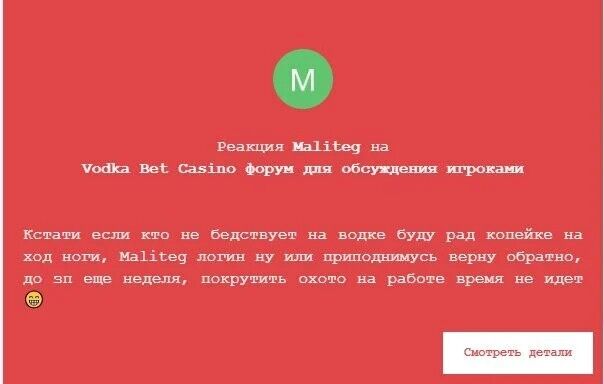 Представляющий игровой ресурс водка так и не появился в данной теме и более того,даже не отреагировал на приглашение нашего Главного Менеджера и Арбитра Форума прийти и дать объяснение по сложившейся ситуации и обьяснить ее!!В моем понимании казино,проект,ресурс,в данном случае в моем понимании игровой ресурс и не более, который игнорирует так нагло и цинично тему,которая касается только их,игнорирует всех нас и Все !!!Ру игровое сообщество в Целом ,да ещё и приглашение главного менеджера и арбитра форума прийти и дать ответы,не заслуживает в принципе не уважения ни вообще ничего!!!!В таком месте нельзя регаться даже,не то,что Играть!!Возникнут более серьезные вопросы к ним,ВСЕ,пиши пропало вообще,если ресурс не хочет идти на контакт даже в элементарной ситуации и ничего обьяснять не хочет!!Делаем выводы те,у кого есть голова !!!!