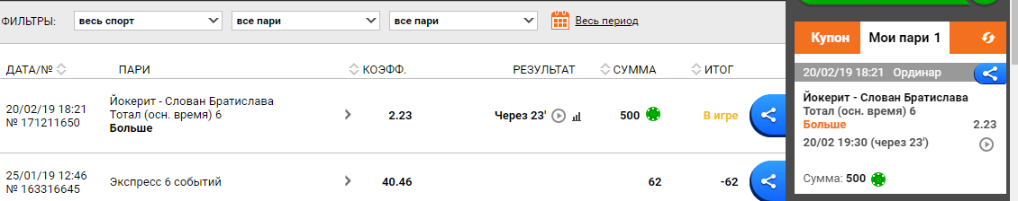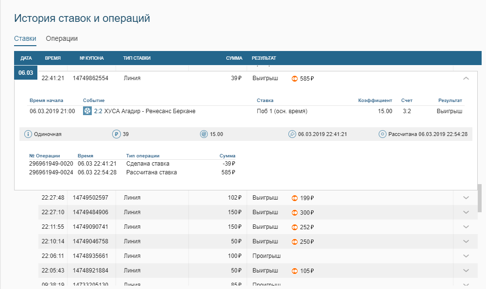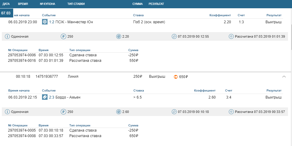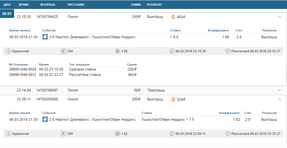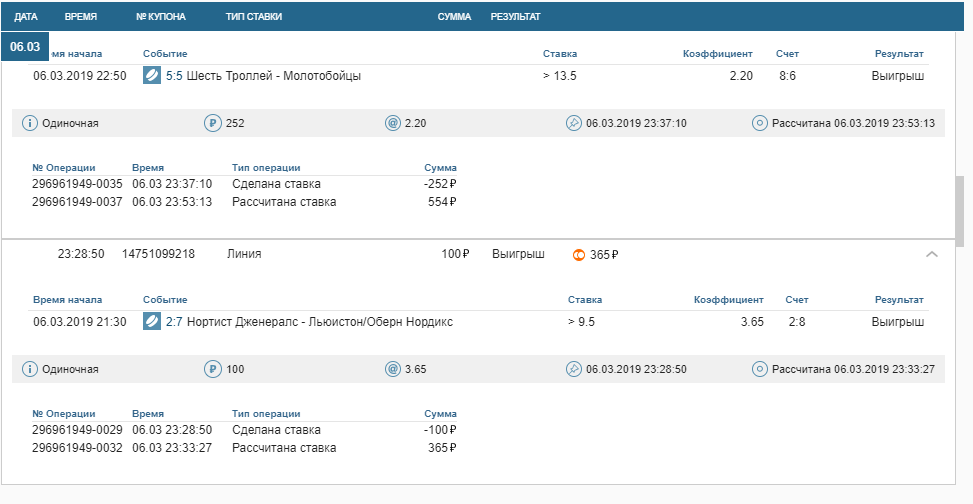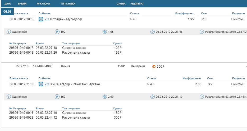 Ставки, выигрыши за 06.03.2019 и две последние по сумме самые мелкие а по кефу самые большие, высокие, поставил камчуки, немного очканул 🙂 они обе зашли на последних минутах просто реально по чуйке поставил печально мелковатые, но радуют такие ставки ординар кеф х15 как говориться знать бы прикуп жил бы в ….
