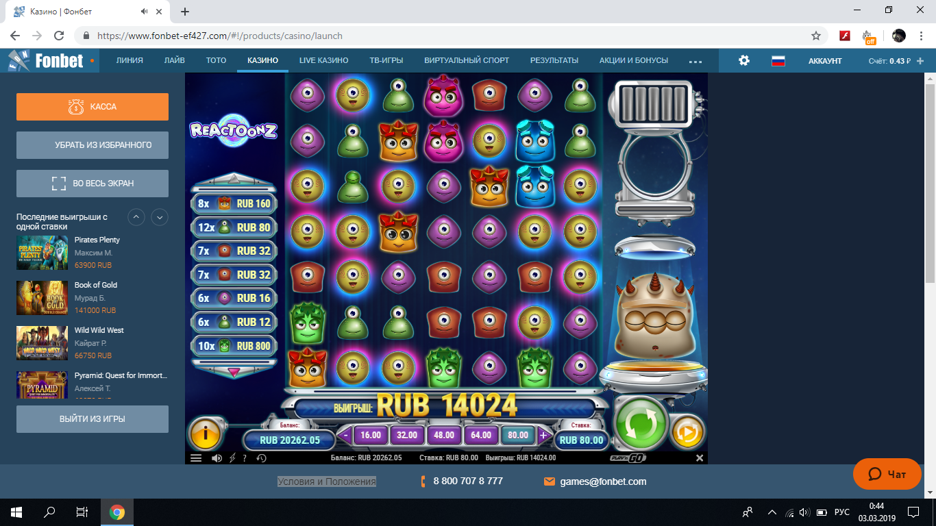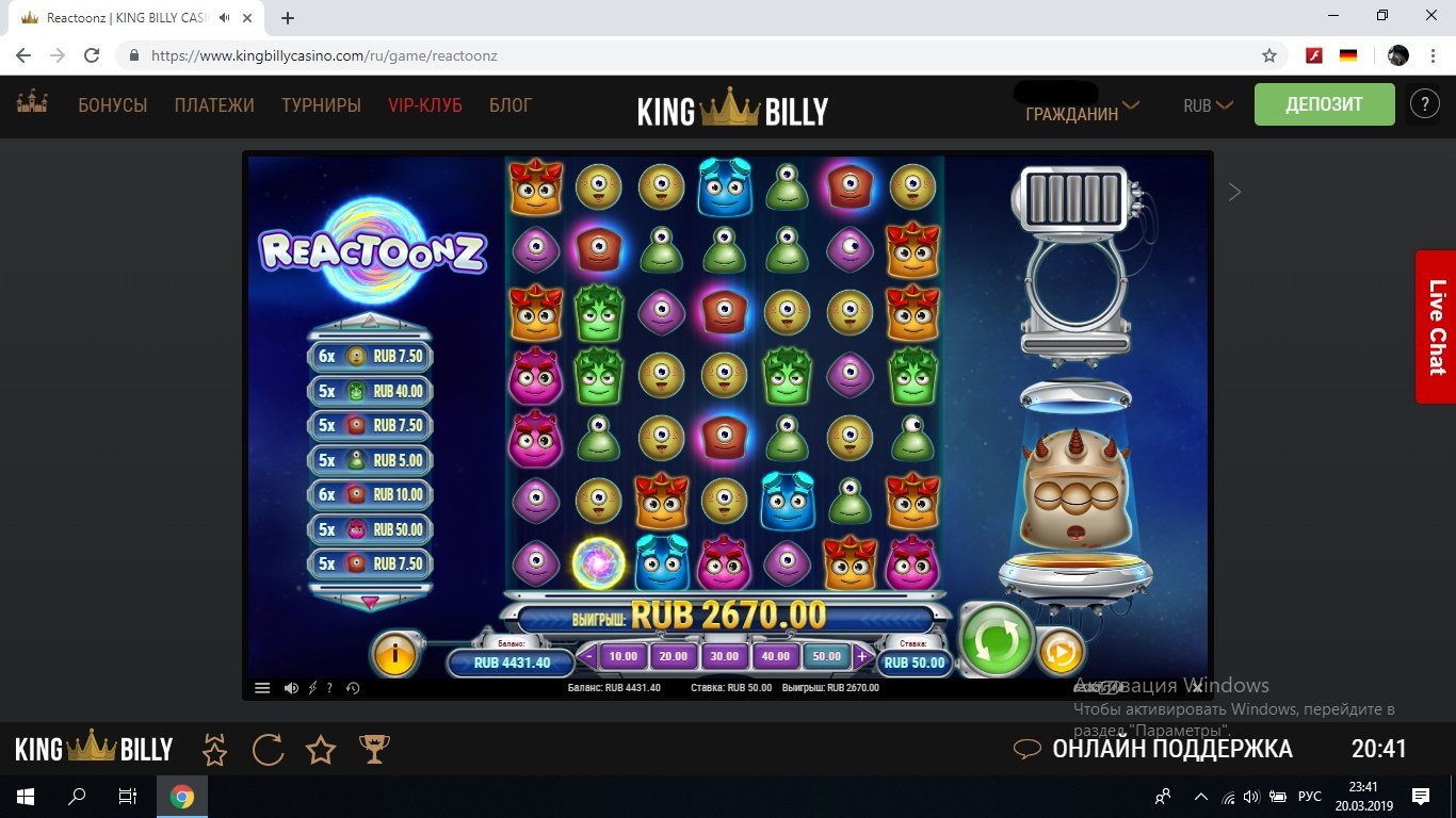 Казино 🔗 депнул под акцию, под бонус 100 фриспинов слоте book of dead спины дало мелочь, после два дня долбил слот reactoonz по разным ставкам, в итоге немного дожал его, опять же жаль что не по 150 ставке отдался, после двух часов ожидания вывода средств зашел на форум и увидел их в листе наблюдения и немного стал волноваться, хотя до этого снимал у них по более суммы и выводили максимум в течения пару часов, акк полностью идентифицирован, возможно время сыграло на скорость вывода, так как было уже поздно утром на следующий день к 11 часам вывод был получен. 1)50р ставка х 53 2) 60р ставка х384 3) 150р ставка х64.