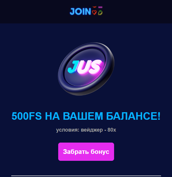 joinus прослал 500 спинов по 2.5р