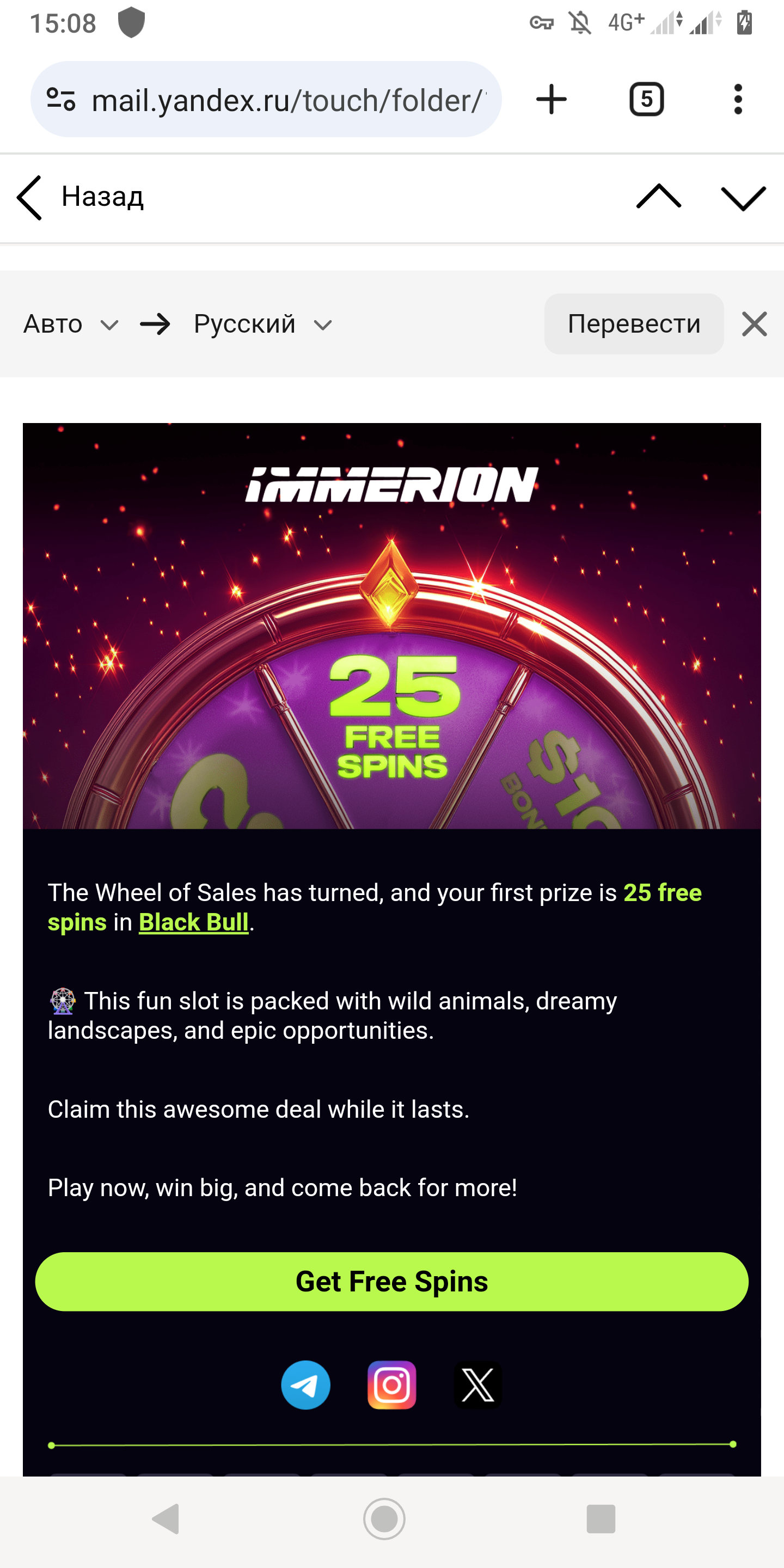 imerrion прислали письмо 25 фс зашел а там 10$ отыгрыш сумасшедший х100 бонус в их валюте проверяйте