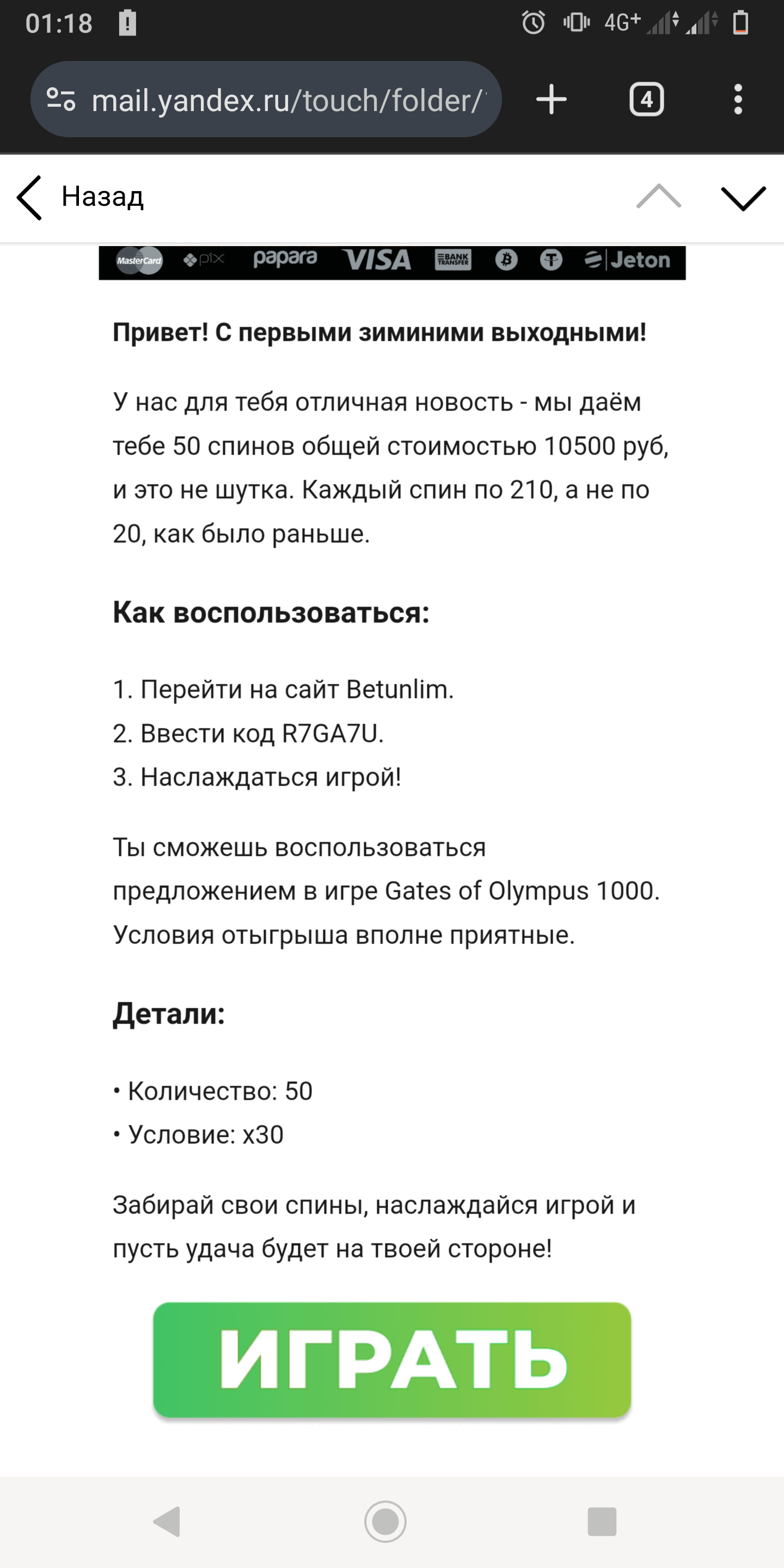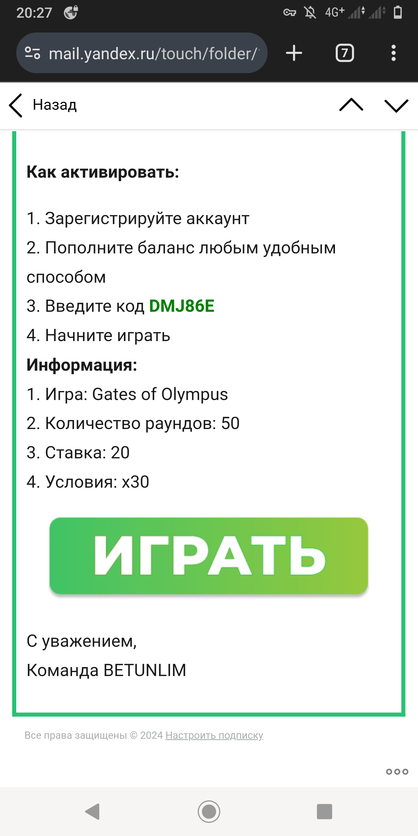betunlim пришло письмо на почту , с промо на 50фс ставка 210рублей вагер 30