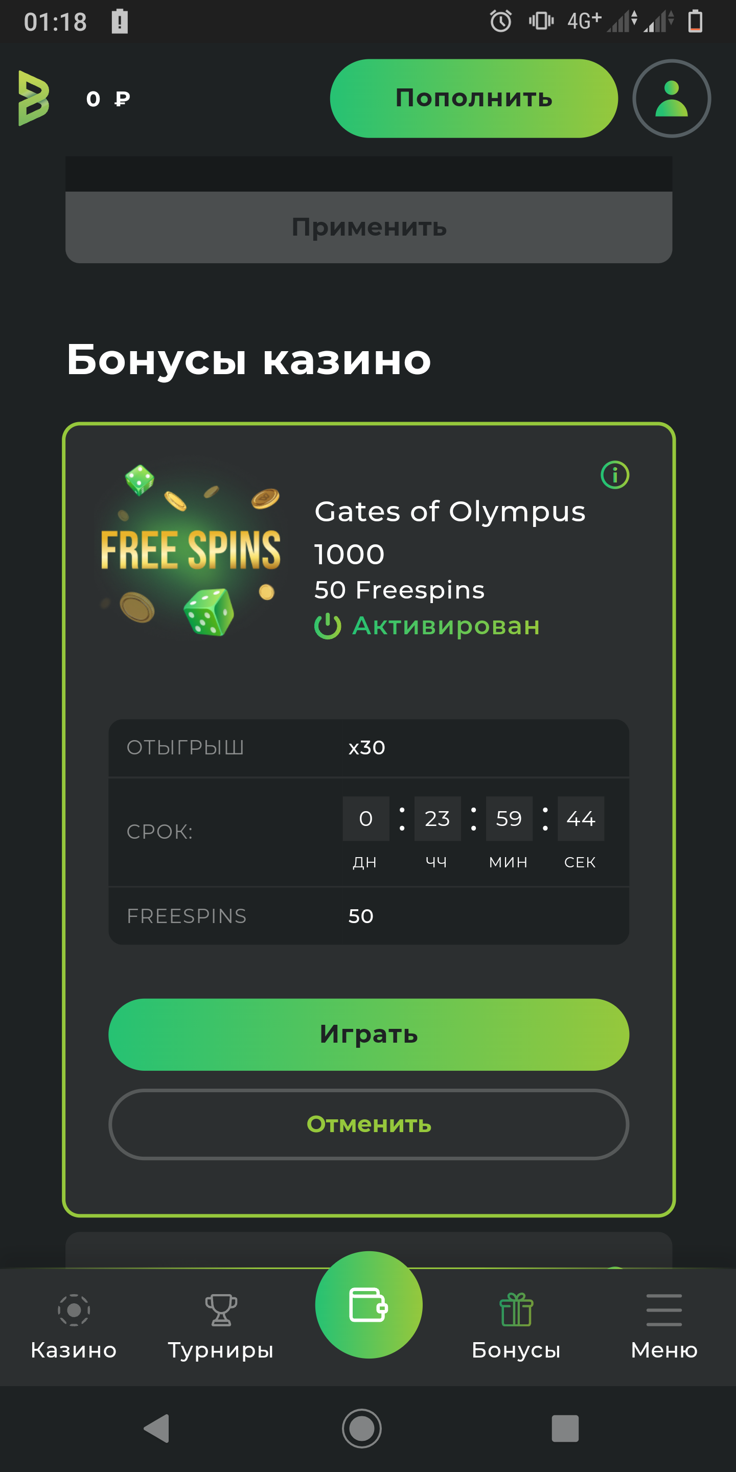 4. Отыгрыш бонуса доступен с реального и с бонусного счёта и только с реального счета, если фриспины получены по промокоду