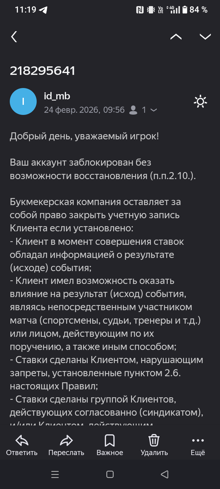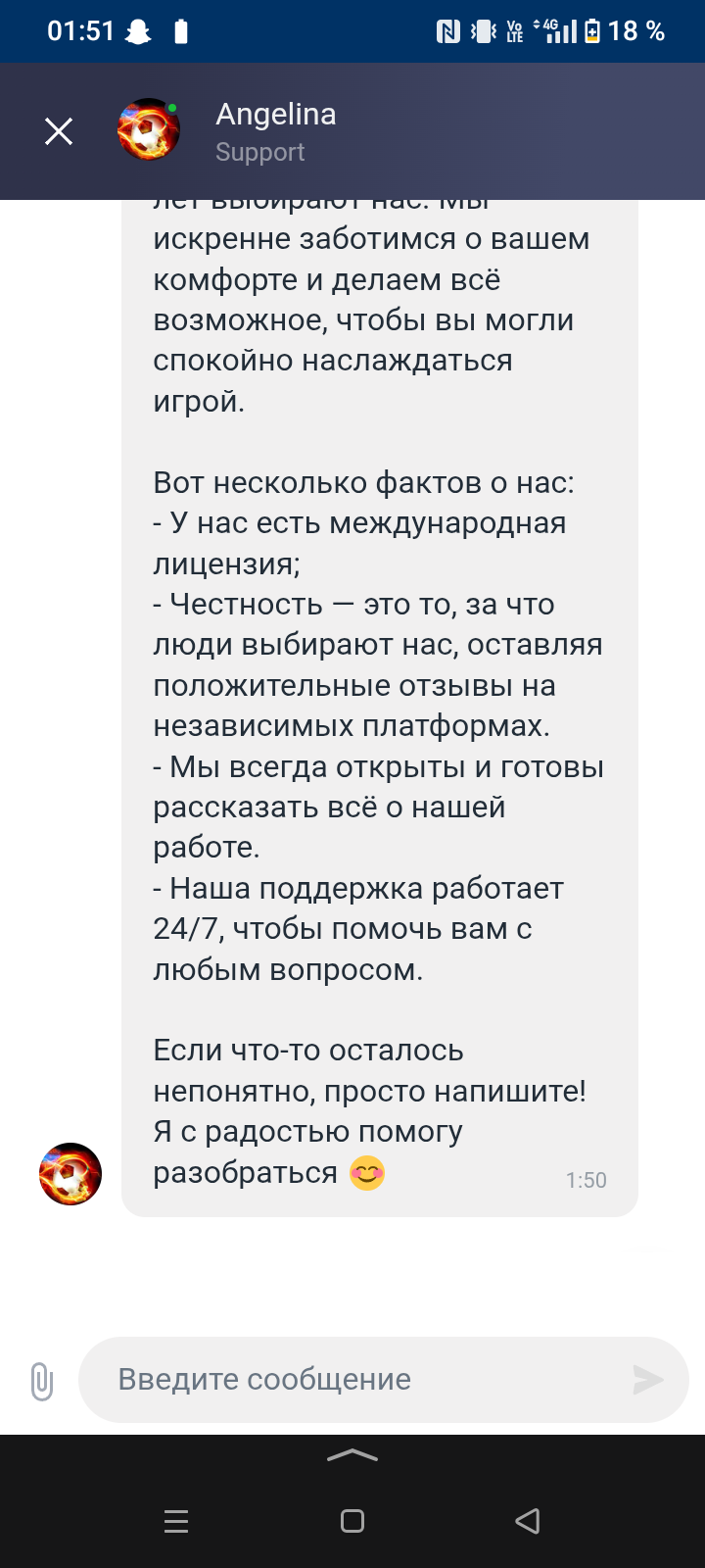 Самое худшее казино заблокировали акк и тянули время скинул документы на верификацию тп игнорила вообще и заблокировали акк без возможности разблокировать будем дальше решать и писать жалобу до этого ждал неделю по регламенту не делали проверку документов просили Id я не смог зайти в акк потому что мне вообще доступ ограничили даже зайти не мог пытался доступ восстановить мне пишут восстановить доступ нельзя не кому не советую этот казино и про какие то ставки мне втирать начали в которых я вообще не шарю скринов много как они время тянули и т д то акк на разморозке находиться но сегодня пойдут жалобы куда можно это полный скам и издевательство решать надо 100% и отобрать лицензию у этого казино даже в тг пишут в чатах то что они акк блокают и не дают вывести но эта неделя была полный ужас 🤦🤦🤦 чат автоматом закрывают сами когда сидишь ждёшь ихого ответа решать добровольно отказываются советую этот казино занести в черный список потому что он скам полный и отвечают как по готовому тесту