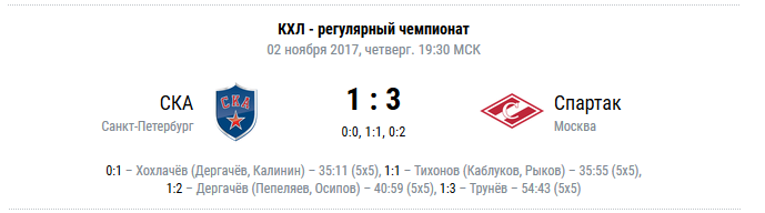 Петербургский С К А на домашней арене не справился с московским «Спартаком», встреча завершилась со счётом 1:3. Петербургские «армейцы» прервали победную серию из шести побед подряд и впервые в сезоне не заработали хотя бы одно очко в турнирную таблицу.