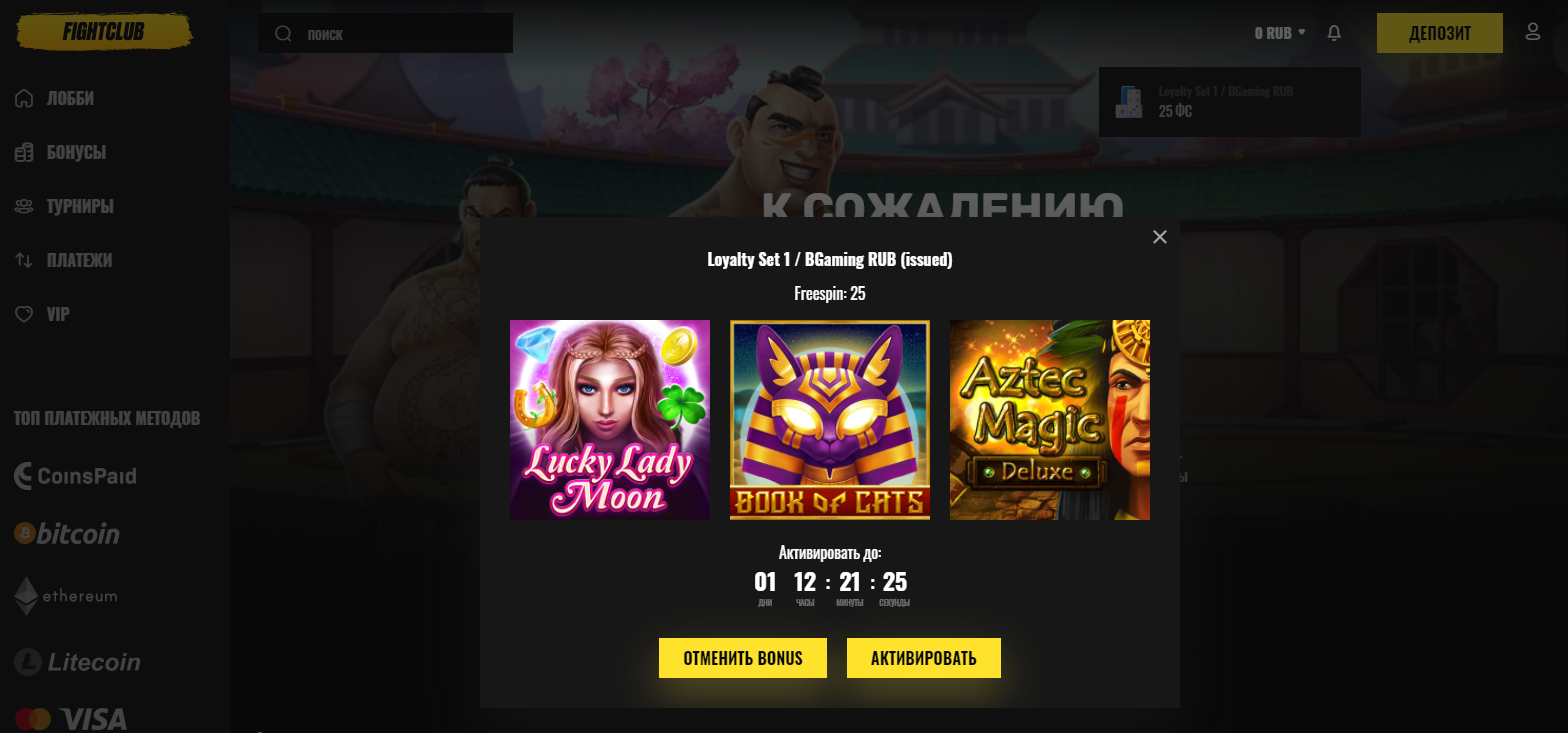 Fightclubcasino дали 25 фриспинов